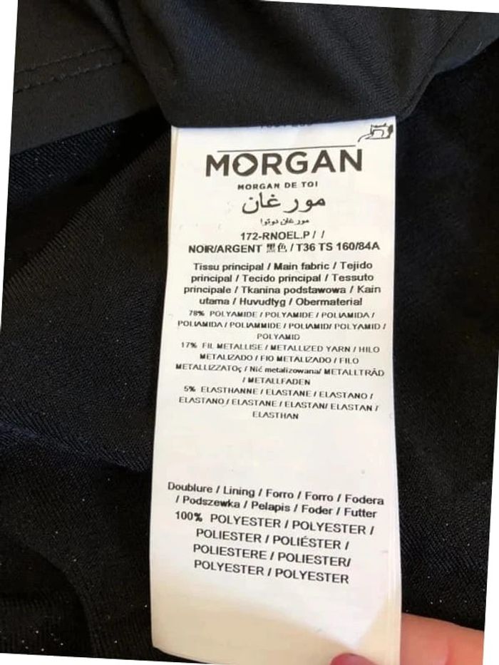 Magnifique robe pailletée noire argentée, sans manches, de marque Morgan. Taille 36. Elle est neuve avec étiquette. aisselle à aisselle 41 cms et plus taille 35 cms et plus longueur depuis épaule 95 cms Le tissu est très extensible 78% polyamide, 17% fil métallisé et 5% elasthanne