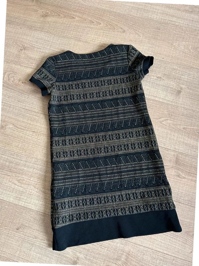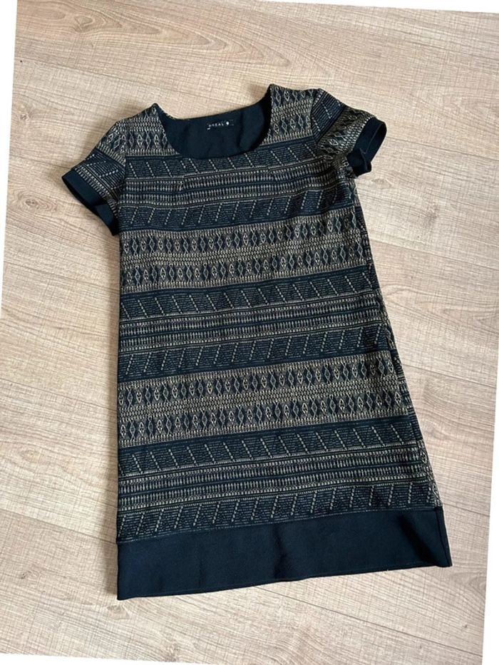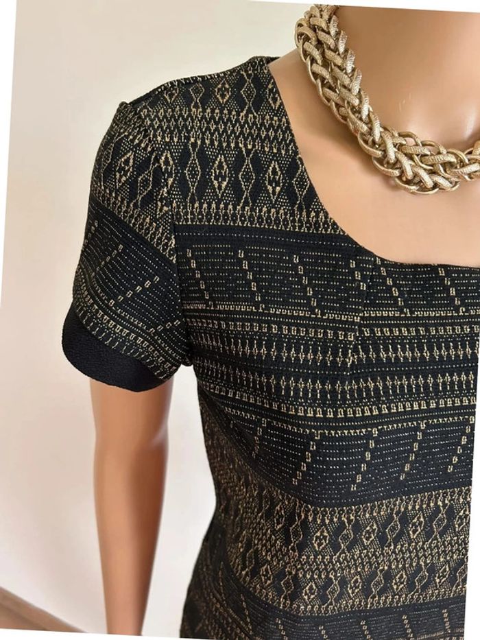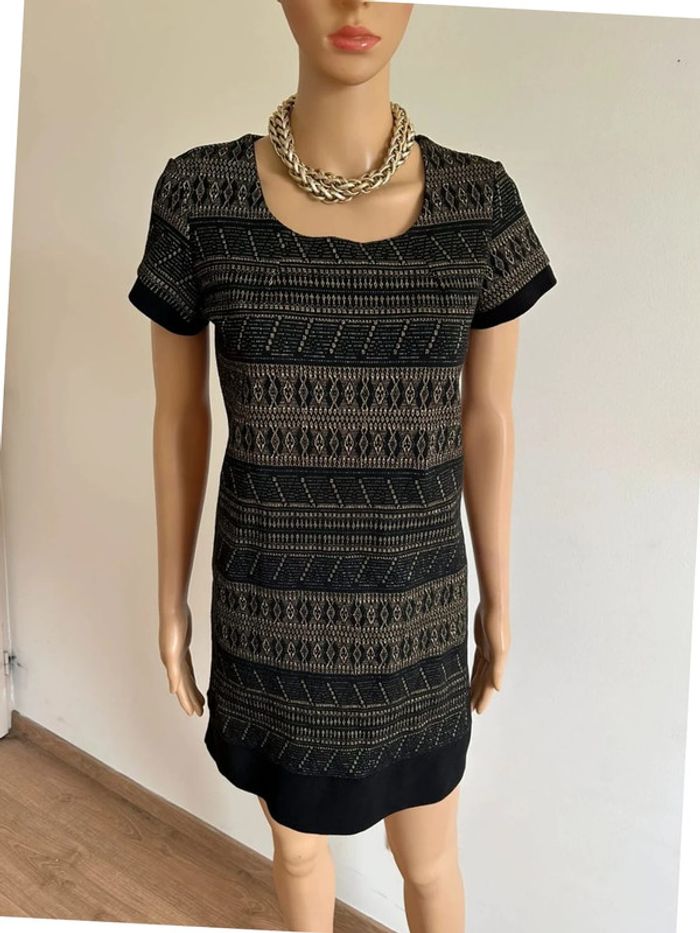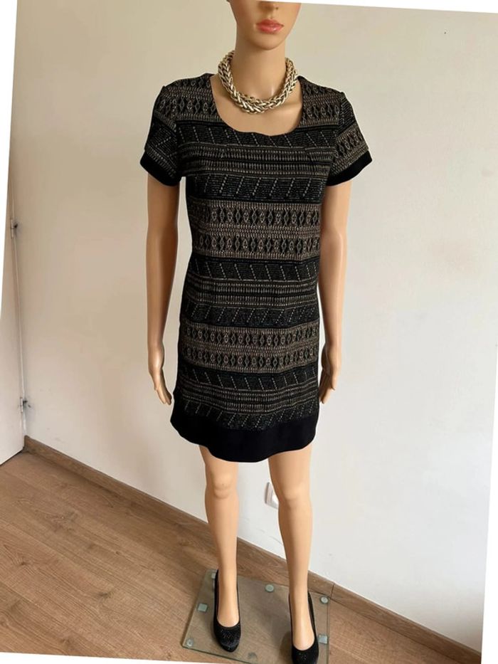 Jolie robe noire et dorée à manches courtes, de marque Breal. Taille 38. Jamais portée, état neuf. aisselle à aisselle 43 cms et plus épaule à épaule 37 cms et plus taille 43 cms et plus longueur depuis épaule 81 cms Le tissu est extensible 55% polyester, 38% coton et 4% elasthanne Le prix reste négociable dans la limite du raisonnable. Un petit cadeau dans le colis 🌸 (Boîte 43)