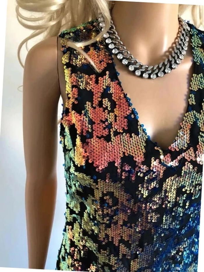 Magnifique robe sans manches, entièrement en sequins, de marque Molly Bracken. Fermeture dans le dos. Taille XS. Elle est neuve avec étiquette (valeur 67€). aisselle à aisselle 42 cms taille 36 cms longueur depuis épaule 85 cms 100% polyester (Boîte 9)