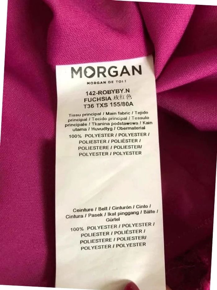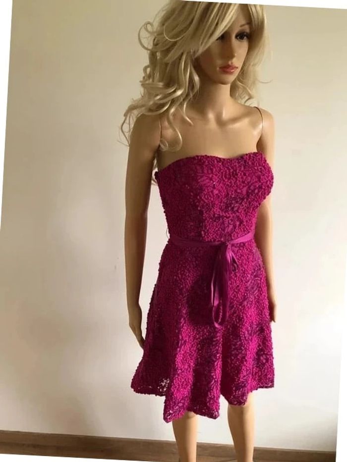 Jolie robe bustier rose fuchsia avec des sequins, ruban à nouer à la taille, de marque Morgan. Taille 36. Fermeture sur le côté. Elle est neuve avec étiquette. aisselle à aisselle 37 cms à 42 cms taille 34 cms longueur depuis aisselle 73 cms Le tissu est extensible 100% polyester (Boîte 40)