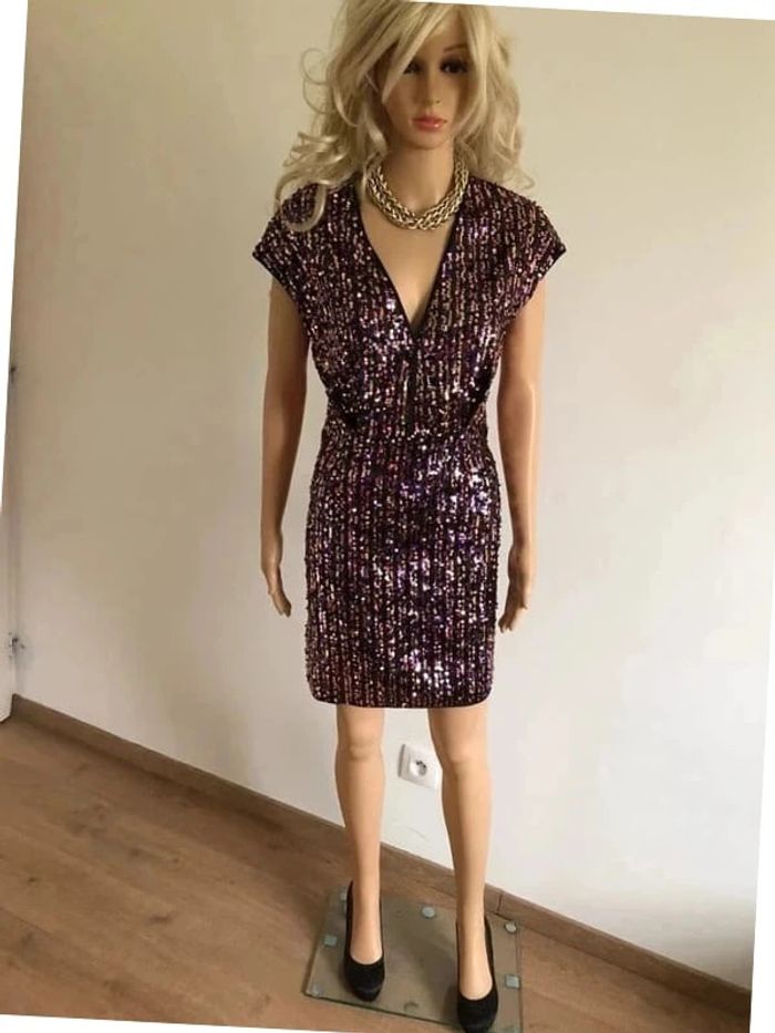 Sublime robe entièrement en sequins, à manches courtes, de marque Morgan, collection Iris Mittenaere. Taille 38. Fermeture dans le dos. Elle est neuve avec étiquette (valeur 115€). aisselle à aisselle 47 cms taille 38 cms longueur depuis épaule 88 cms 100% polyester Un petit cadeau dans le colis (Boîte 43)