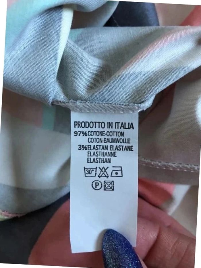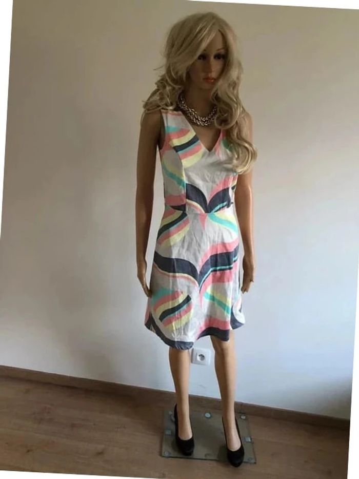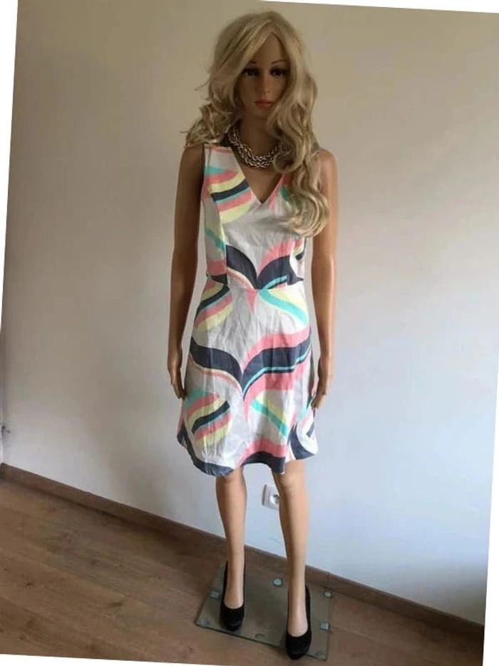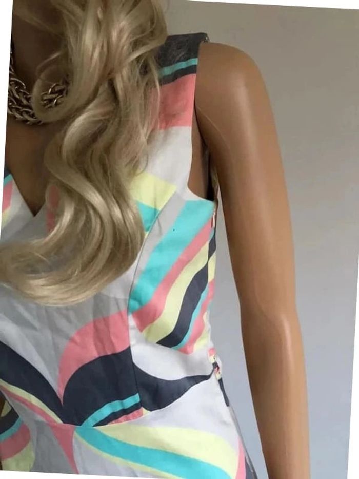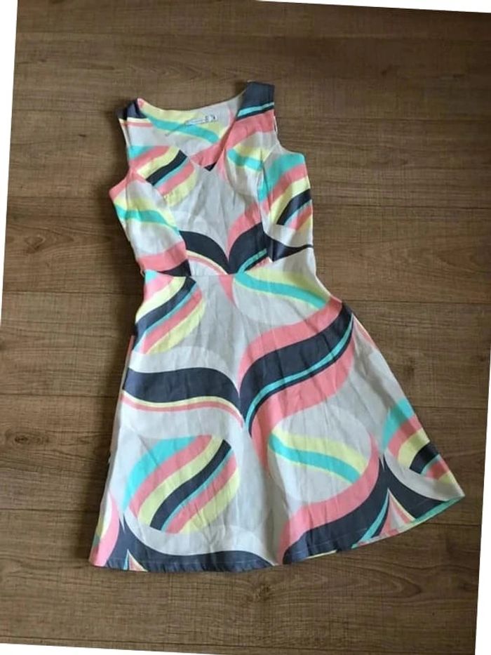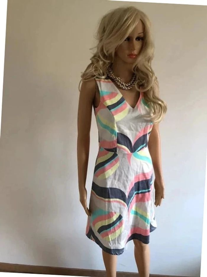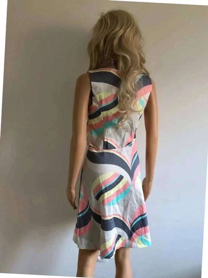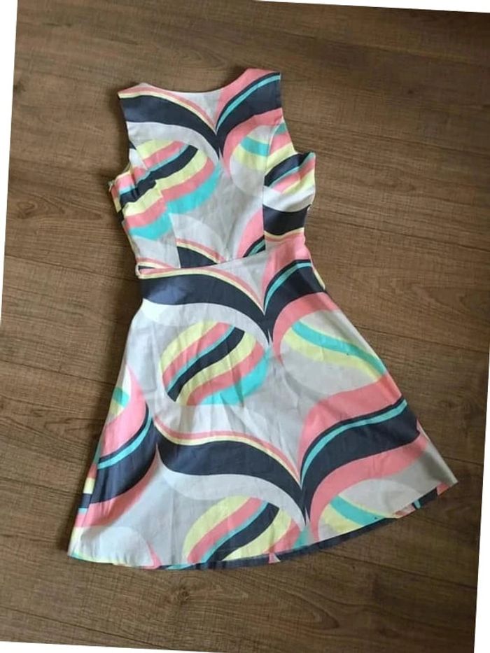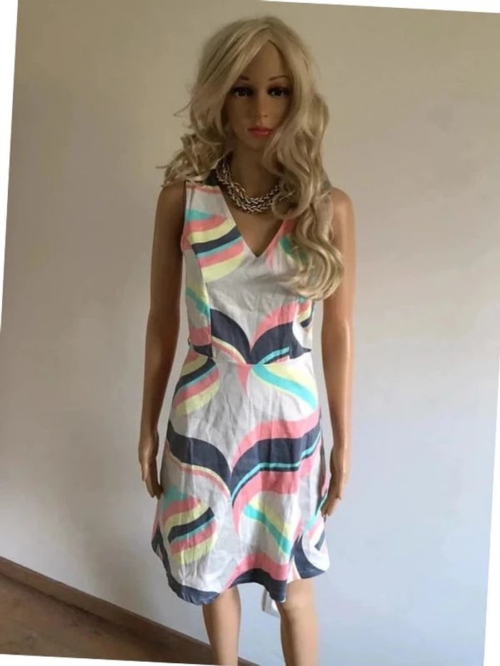 Jolie robe imprimée multicolore sans manches, de marque LolaLiza. Taille 34 qui peut convenir pour un petit 36. Fermeture sur le côté. Passants pour mettre une petite ceinture. Jamais portée car trop petite pour moi. aisselle à aisselle 40 cms taille 35 cms longueur depuis épaule 90 cms 97% coton et 3% elasthanne