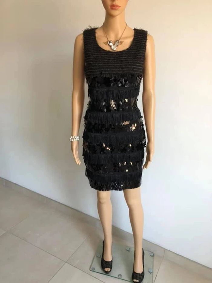 Magnifique robe noire sans manches, avec franges et sequins noirs sur le devant, de marque Molly Bracken. Taille S. Elle est neuve avec étiquette (valeur 60€). aisselle à aisselle 44 cms et plus taille 40 cms longueur depuis épaule 88 cms 45% polyester, 40% polyamide et 15% coton Le prix reste négociable dans la limite du raisonnable. Un petit cadeau dans le colis 🌸
