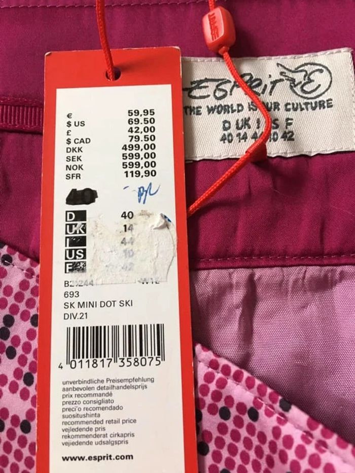 Jolie jupe fluide satinée, dans les tons roses et violets, de marque Esprit. Taille 42. Deux poches sur le devant. Fermeture sur le côté. Elle est neuve avec étiquette (valeur 60€). taille 42 cms longueur 58 cms 100% polyester Le prix reste négociable dans la limite du raisonnable. Un petit cadeau dans le colis 🌸