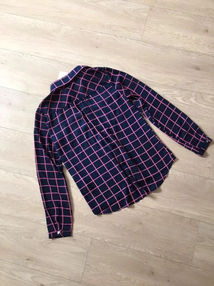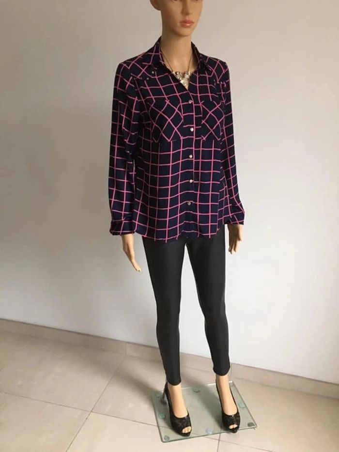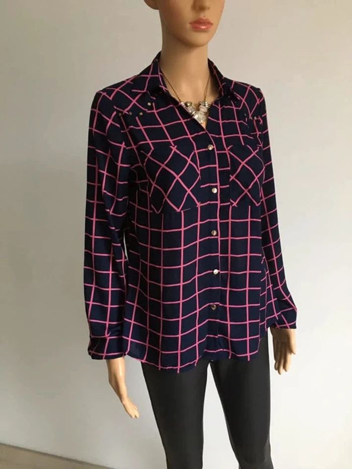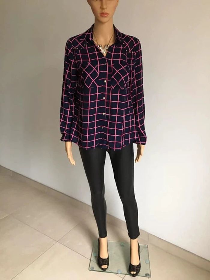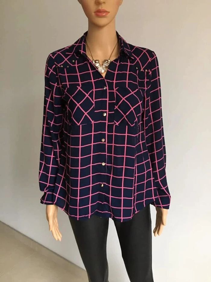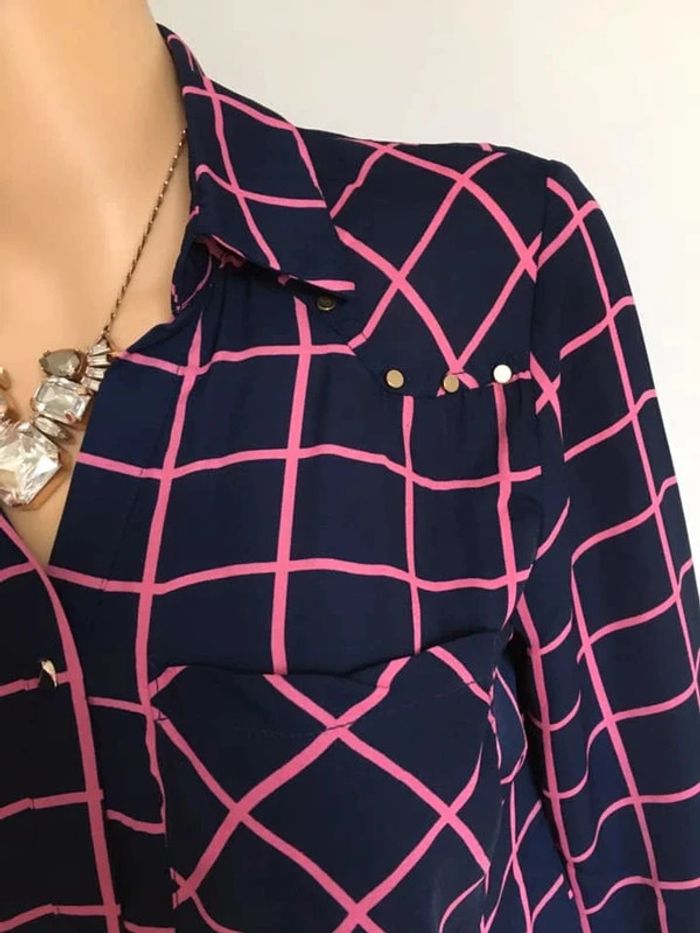 Jolie chemise bleue marine et rose, à manches longues.