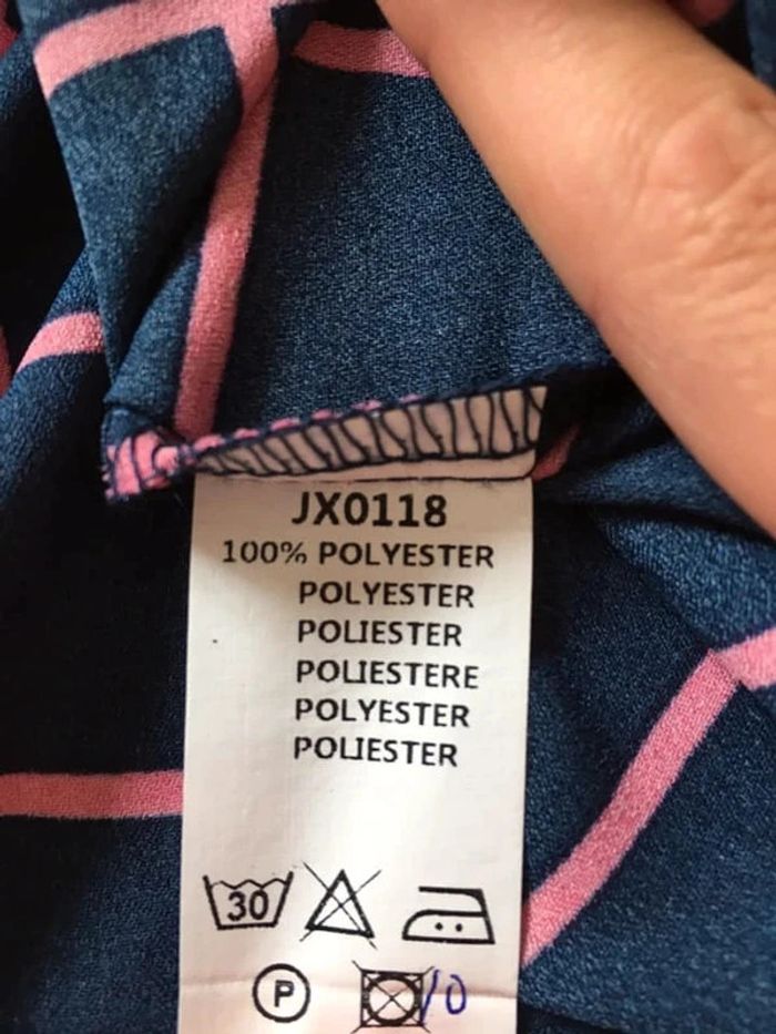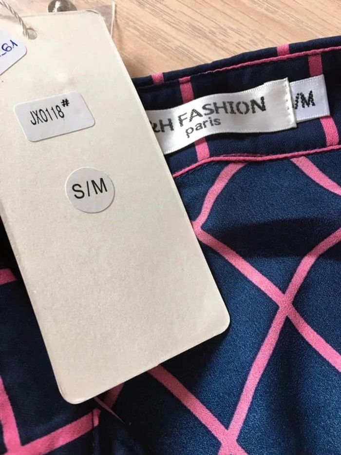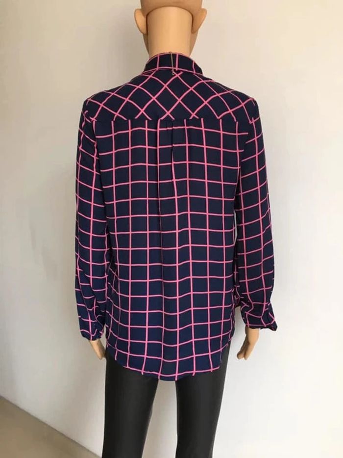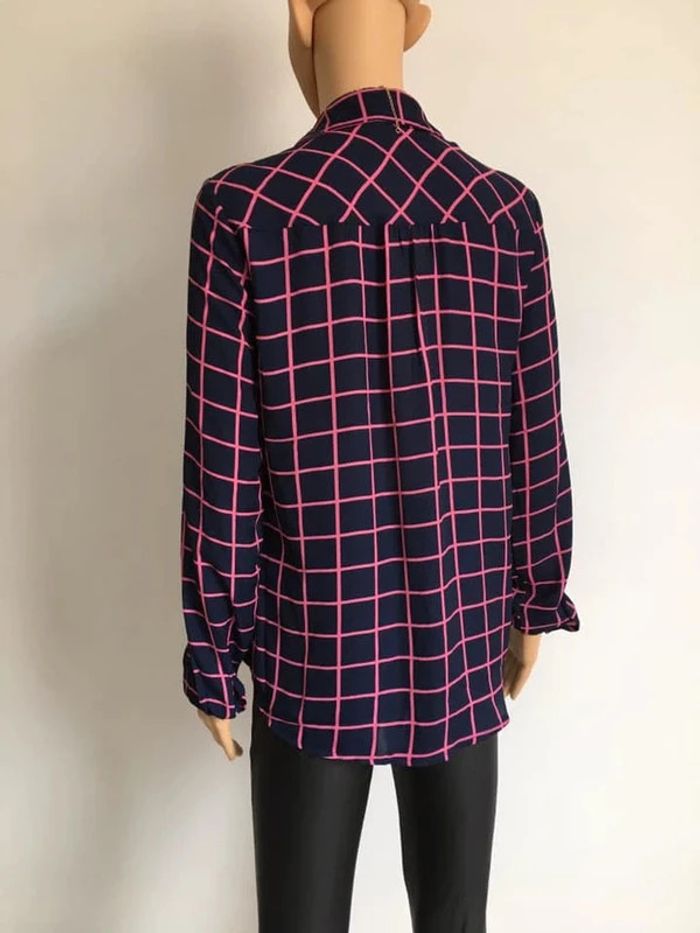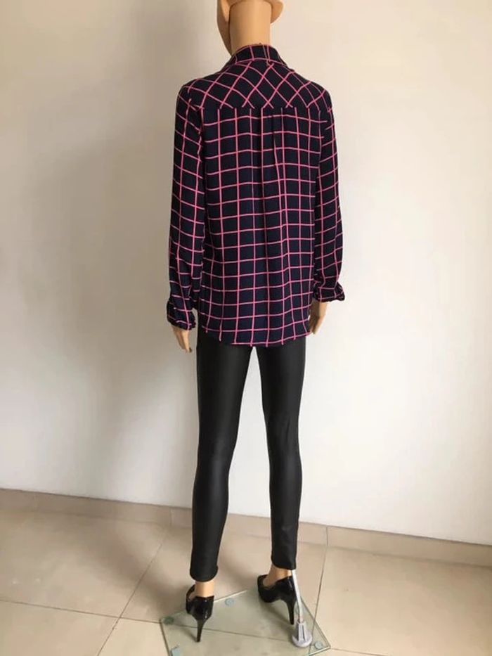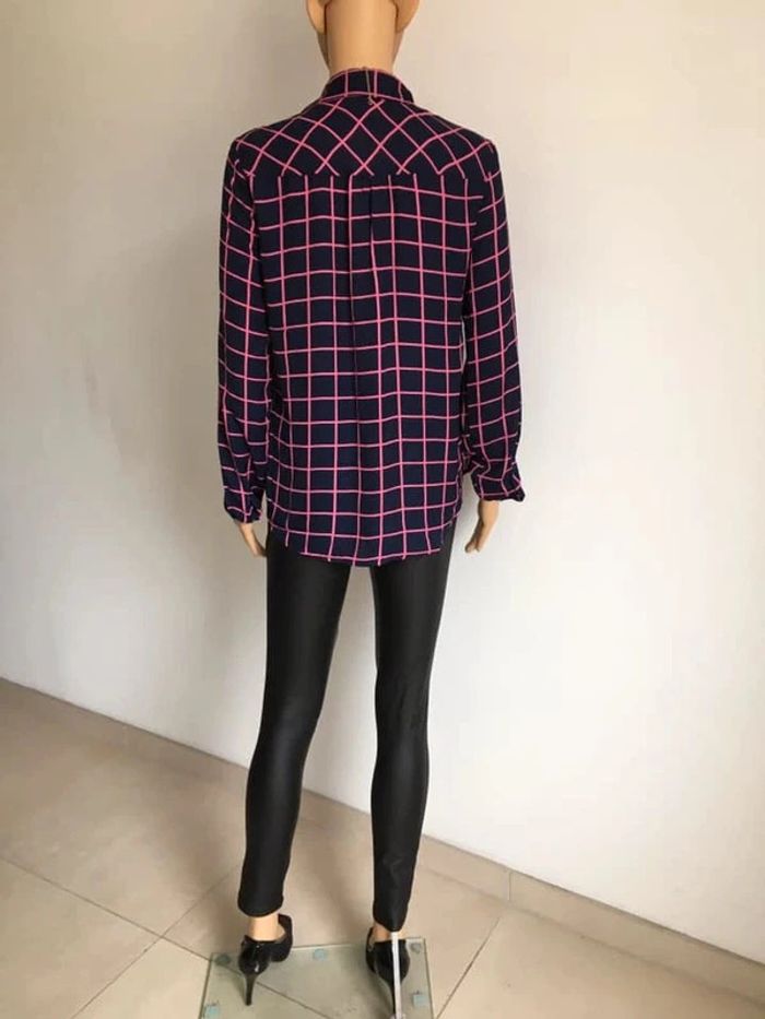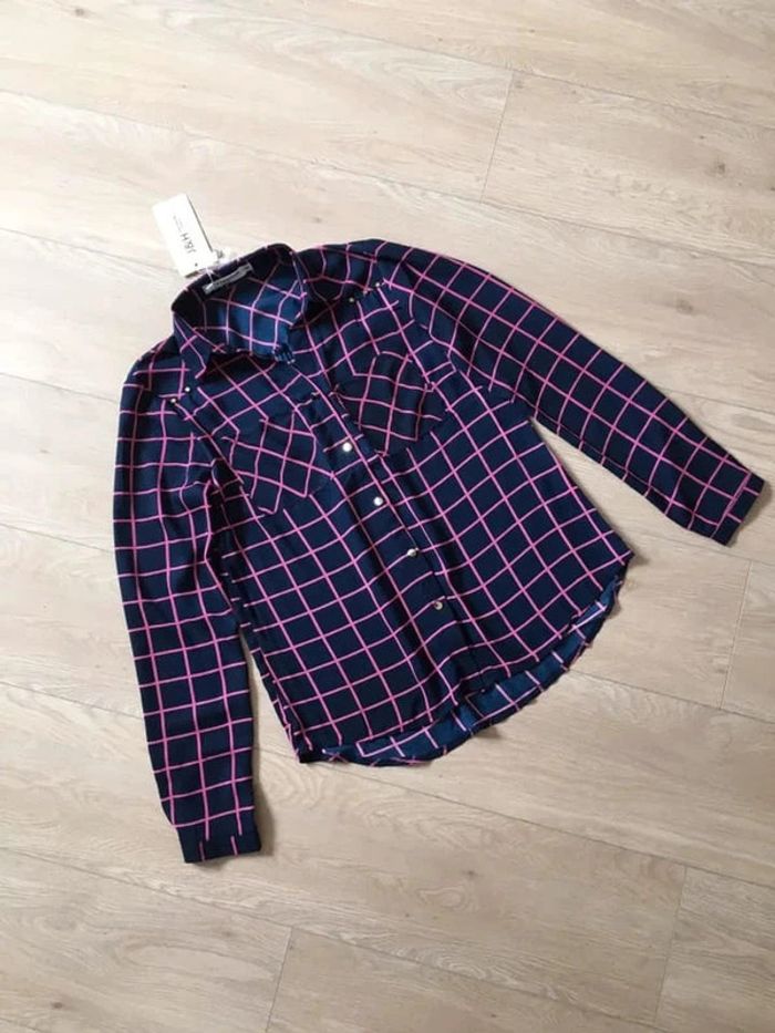 Jolie chemise bleue marine et rose, à manches longues.