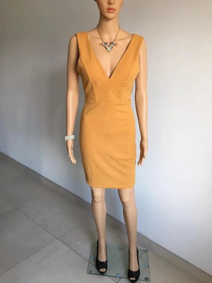 Magnifique robe moutarde sans manches, avec liserés brillants. Taille unique qui convient jusqu’au 36. Elle est neuve avec étiquette. aisselle à aisselle 42 cms taille jusqu’à 36 cms longueur depuis épaule 89 cms Le tissu est extensible 95% polyester et 5% elasthanne Le prix reste négociable dans la limite du raisonnable. Un petit cadeau dans le colis 🌸