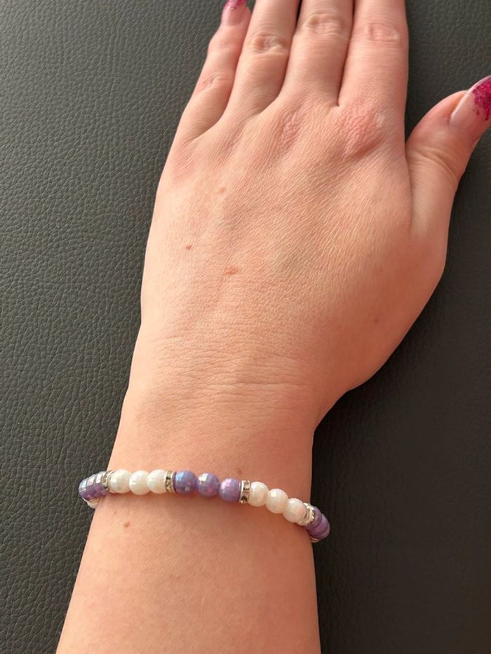 Joli bracelet blanc mauve et argenté en perles. Taille unique. Jamais porté, état neuf.