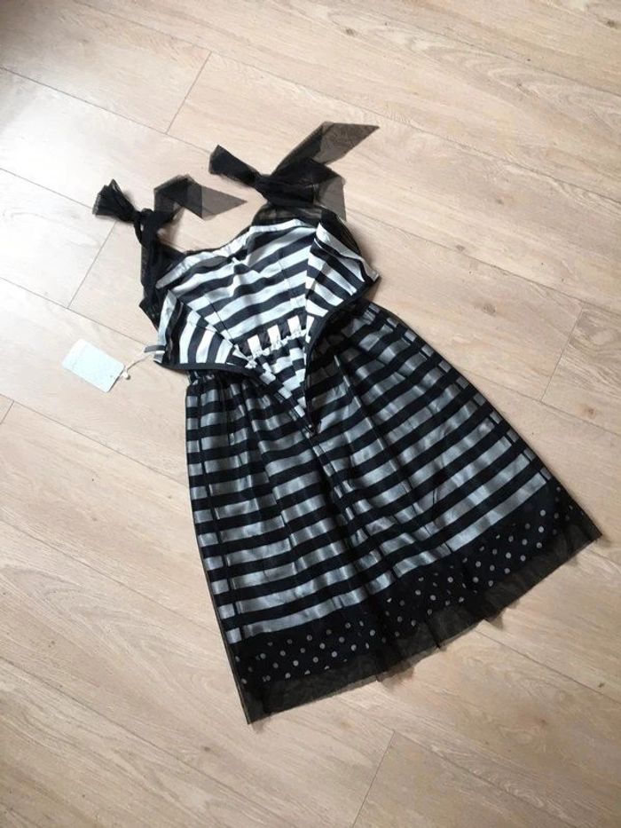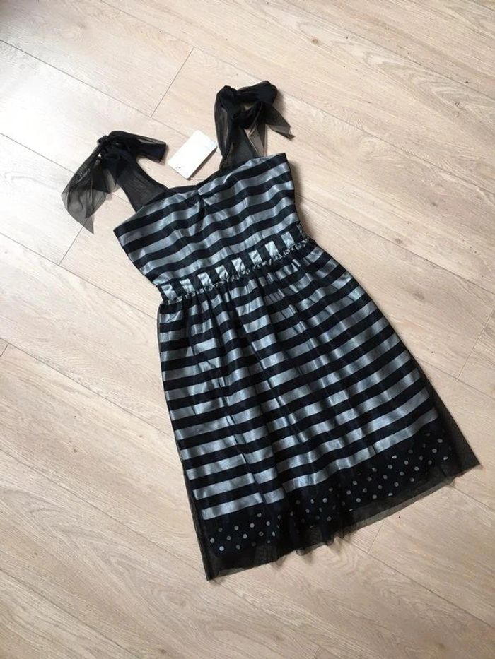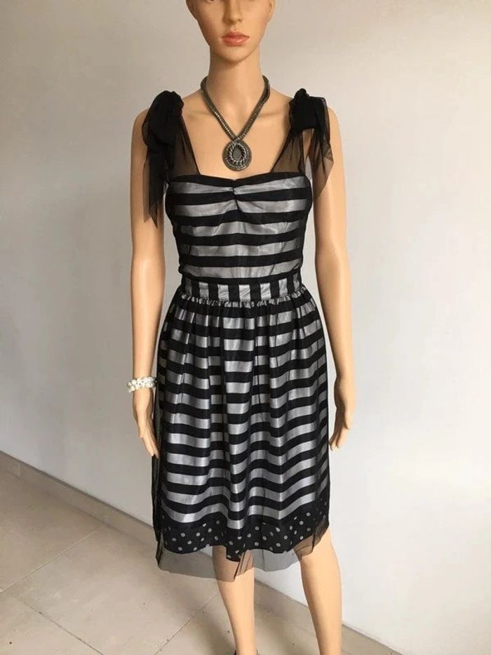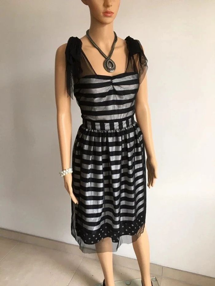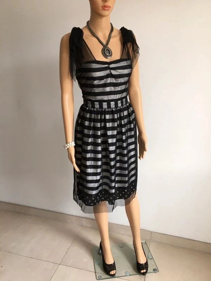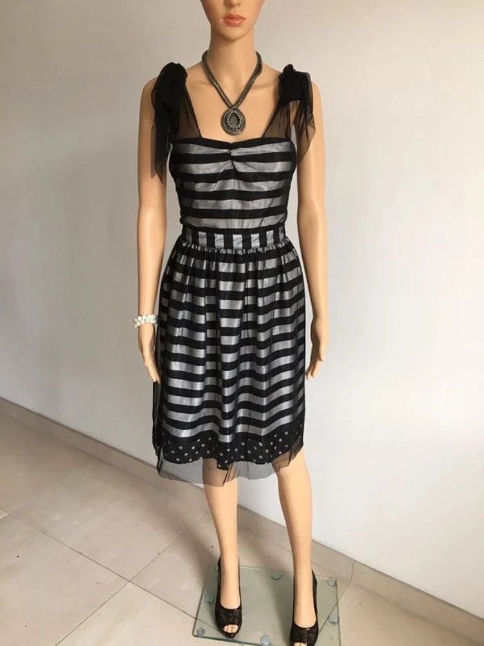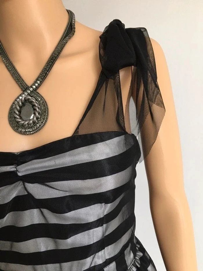 Magnifique robe rayée noire et grise argentée, sans manches, avec noeud à nouer sur les épaules, de marque Naf Naf. Taille 36. Elle est neuve avec étiquette. aisselle à aisselle 42 cms taille 35 cms longueur depuis épaule 96 cms 100% polyester Le prix reste négociable dans la limite du raisonnable. Un petit cadeau dans le colis. (Boîte 35)