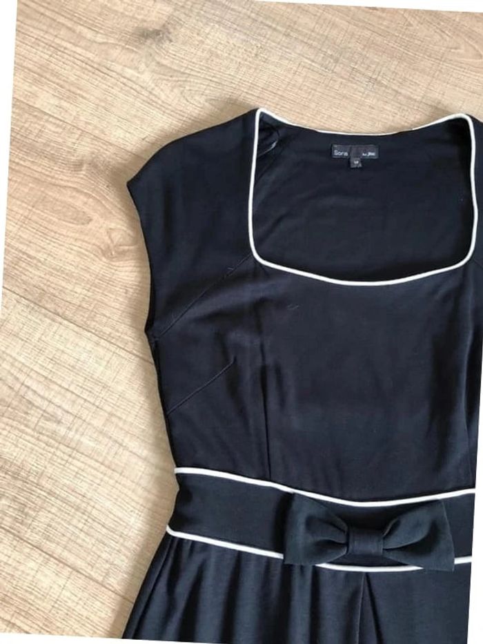 Jolie robe noire et blanche, à manches courtes, de marque Sora by JBC. Fermeture sur le côté. Taille 38. Portée quelques fois, en très bon état. aisselle à aisselle 41 cms à 49 cms taille 35 cms à 39 cms longueur depuis épaule 100 cms Le tissu est extensible 87% viscose, 10% polyester et 3% elasthanne Le prix reste négociable dans la limite du raisonnable. Un petit cadeau dans le colis. (Boîte 45)