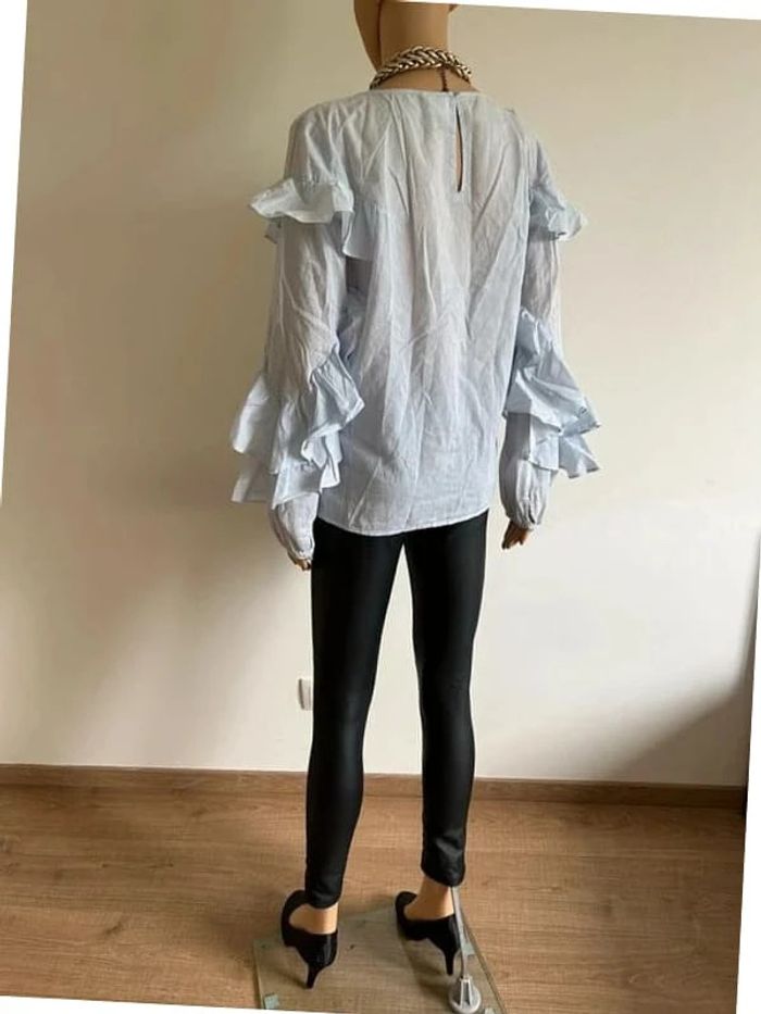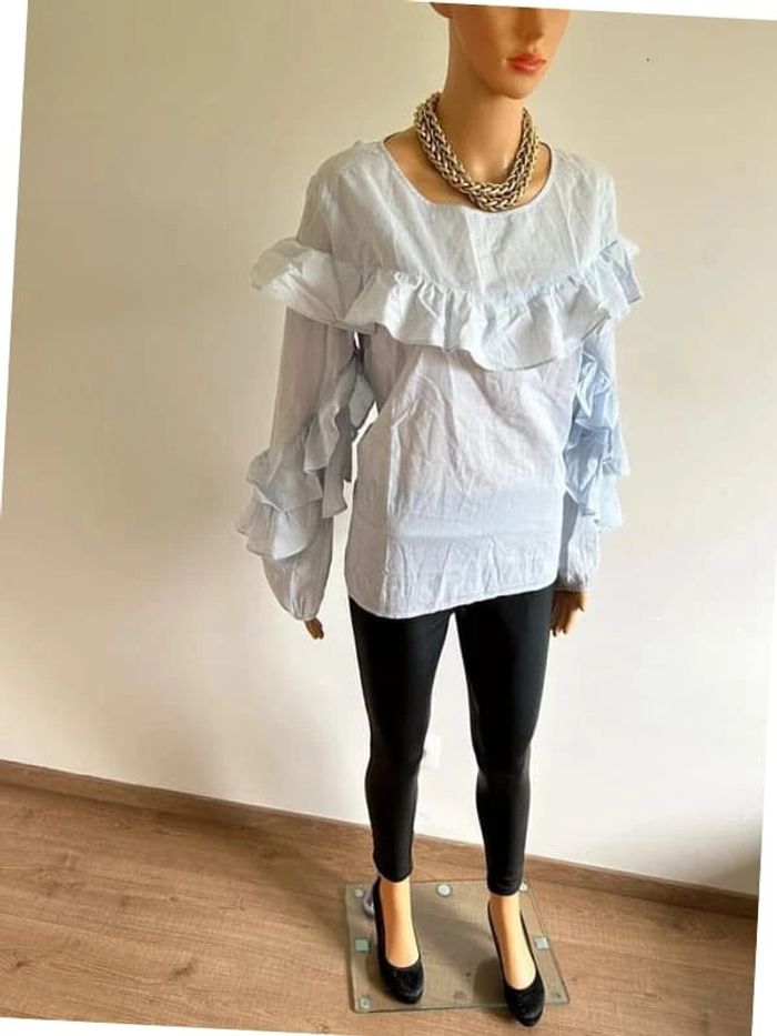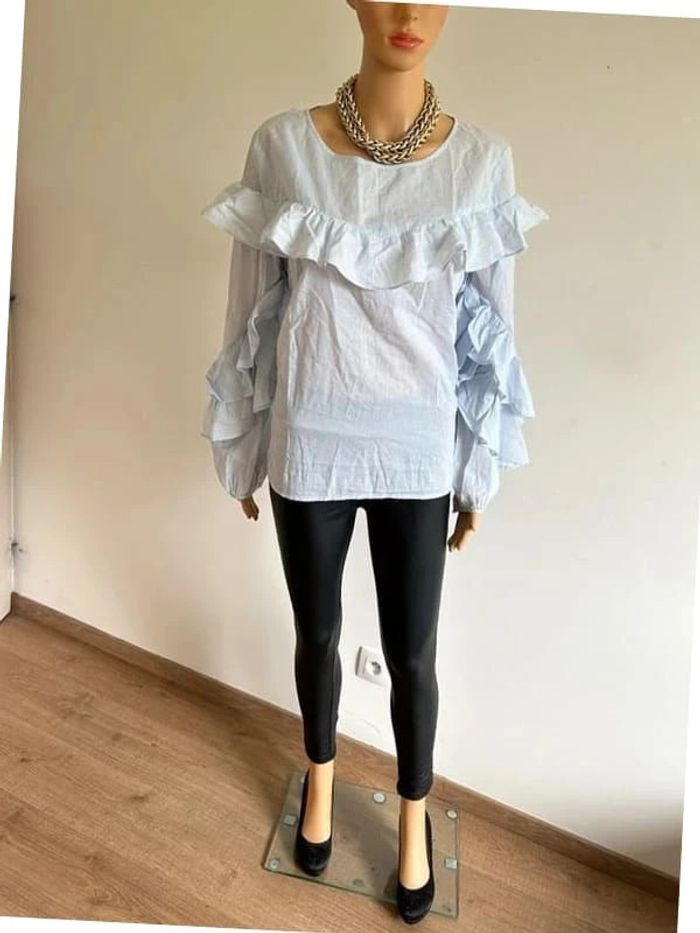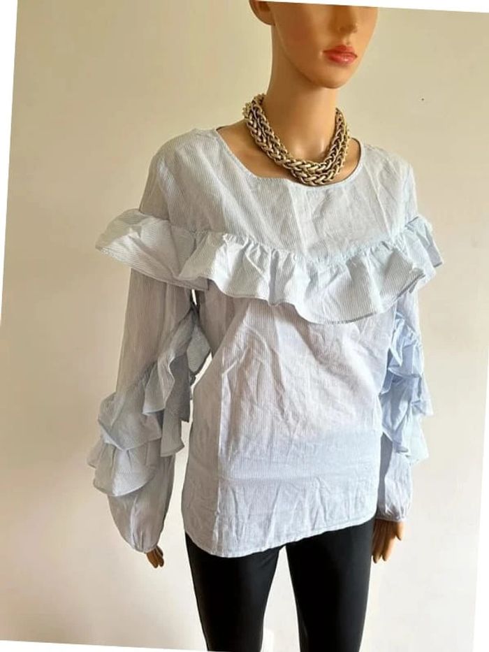 Jolie blouse bleue et blanche à rayures, a manches longues, de marque VILA. Volants au niveau des bras. Taille L. Portée plusieurs fois, en bon état. aisselle à aisselle 51 cms épaule à épaule 41 cms longueur manches 62 cms taille 51 cms longueur depuis épaule 63 cms Étiquette intérieure de composition coupée Le prix reste négociable dans la limite du raisonnable. (Boîte 4)