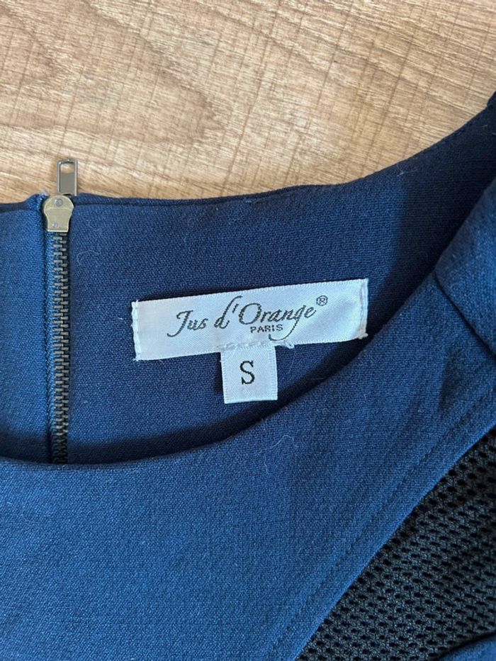 Jolie robe bleue marine et noire sans manches, de marque Jus d’Orange. Fermeture dans le dos. Taille S. Portée plusieurs fois, en très bon état. aisselle à aisselle 46 cms taille 38 cms longueur depuis épaule 85 cms Un ourlet a été fait sur le bas de la robe Étiquette intérieure de composition coupée Le prix reste négociable dans la limite du raisonnable. Un petit cadeau dans le colis 🌸