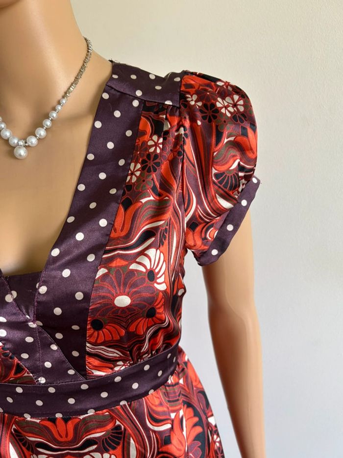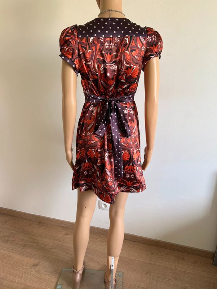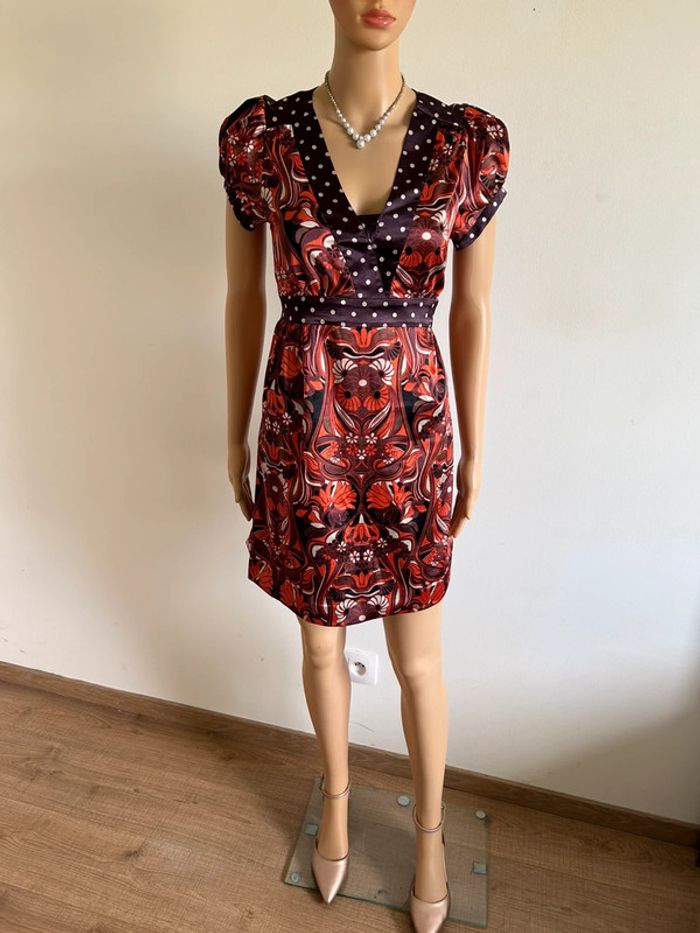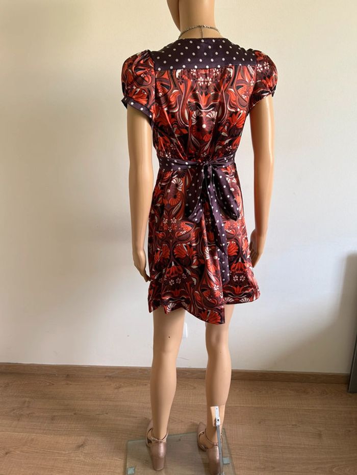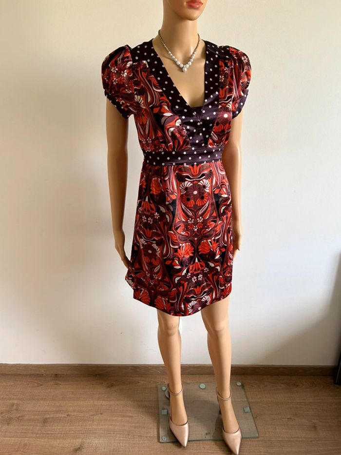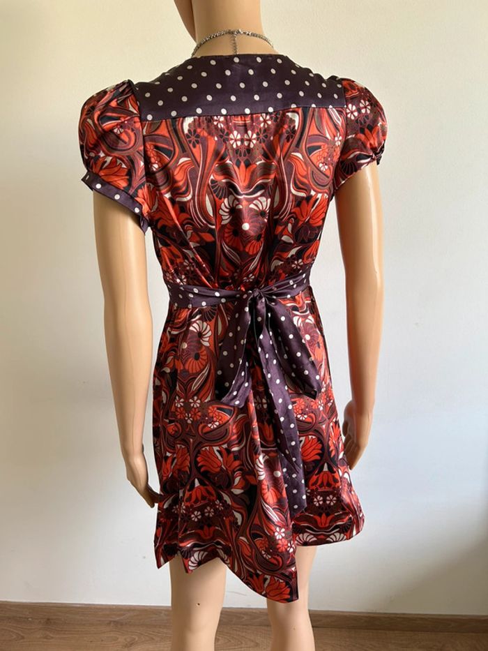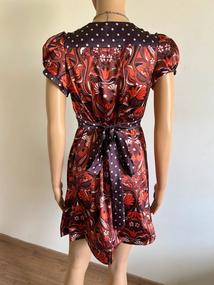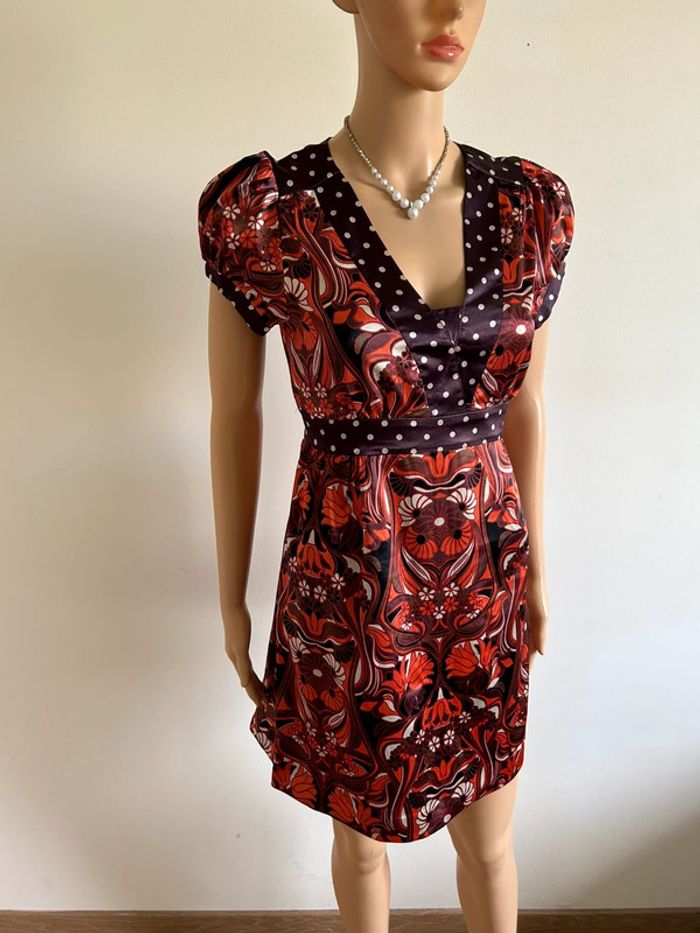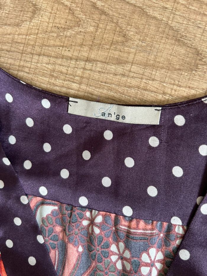 Jolie robe imprimée satinée à manches courtes, de marque An’ge. Correspond à une taille 36 (étiquette de taille coupée, voir mesures en dessous). Portée quelques fois, en très bon état. aisselle à aisselle 43 cms épaule à épaule 36 cms taille 37 cms longueur depuis épaule 83 cms Étiquette intérieure de composition coupée Le prix reste négociable dans la limite du raisonnable. Un petit cadeau dans le colis 🌸