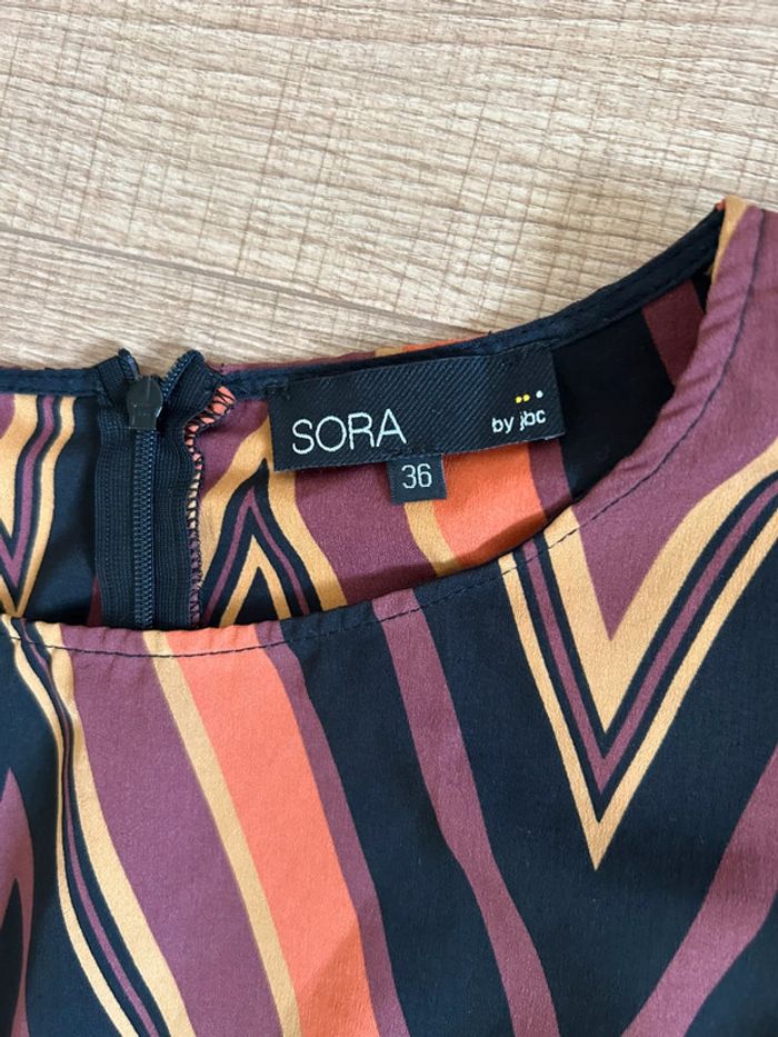 Jolie robe imprimée avec manches 3/4, de marque Sora by JBC. Fermeture dans le dos. Taille 36. Jamais portée, état neuf. aisselle à aisselle 44 cms épaule à épaule 36 cms taille 42 cms longueur depuis épaule 84 cms 100% polyester Le prix reste négociable dans la limite du raisonnable. Un petit cadeau dans le colis 🌸