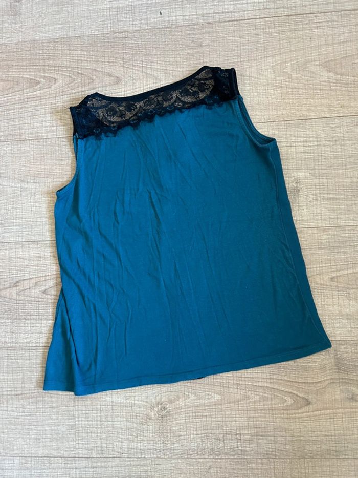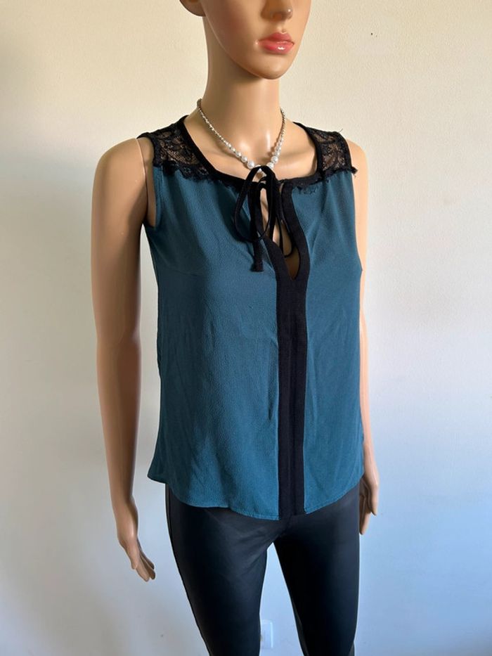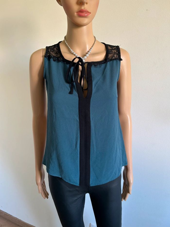 Jolie blouse bleue canard et noire avec dentelle, sans manches, de marque Naf Naf. Taille S. Portée quelques fois, en très bon état. aisselle à aisselle 41 cms taille 41 cms longueur depuis épaule 55 cms Étiquette intérieure de composition coupée