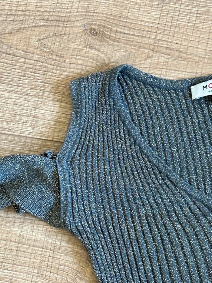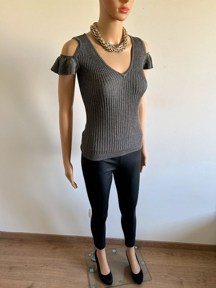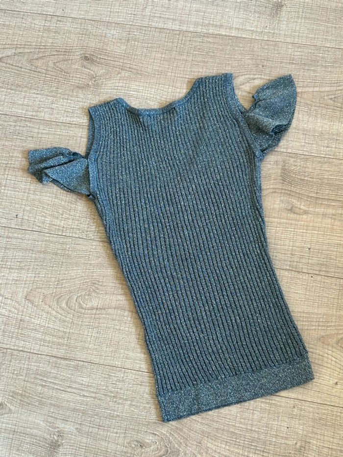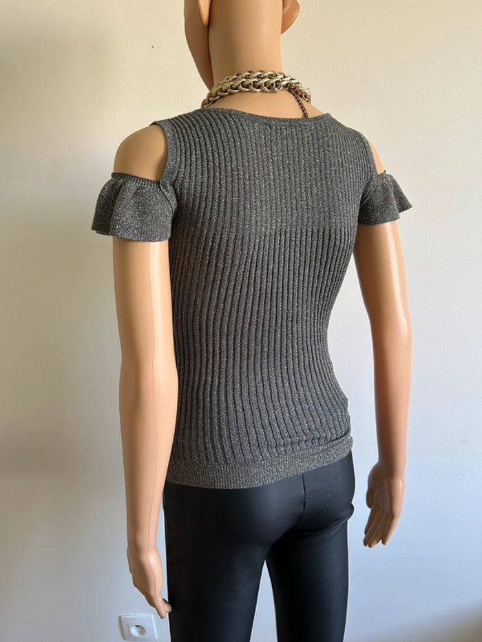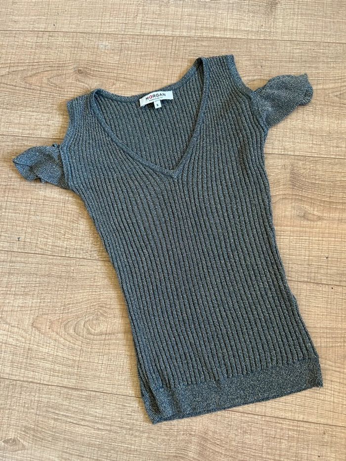 Joli haut gris pailleté à manches courtes, avec épaules dénudées, de marque Morgan. Taille S. Jamais porté, état neuf. aisselle à aisselle 32 cms à 42 cms taille 27 cms à 40 cms longueur depuis épaule 55 cms Le tissu est extensible Étiquette intérieure de composition coupée. Le prix reste négociable dans la limite du raisonnable. Un petit cadeau dans le colis 🌸 (Boîte 1)