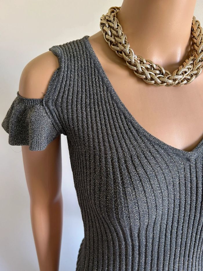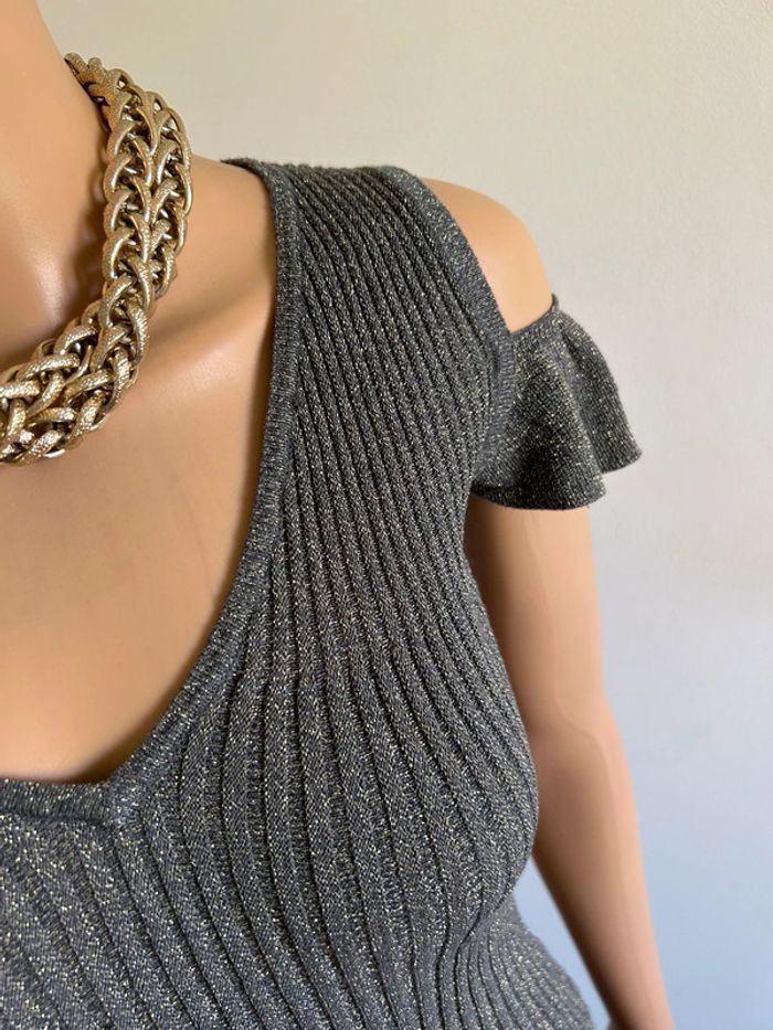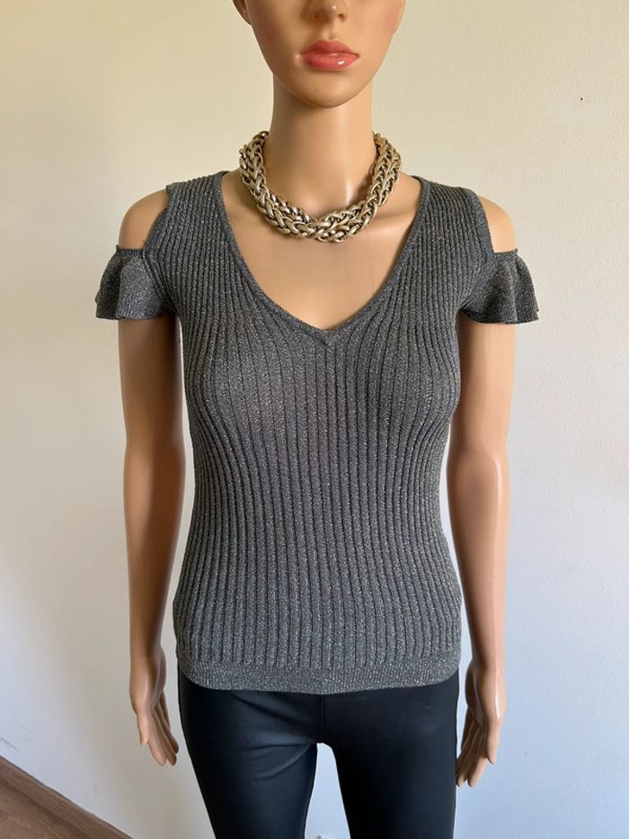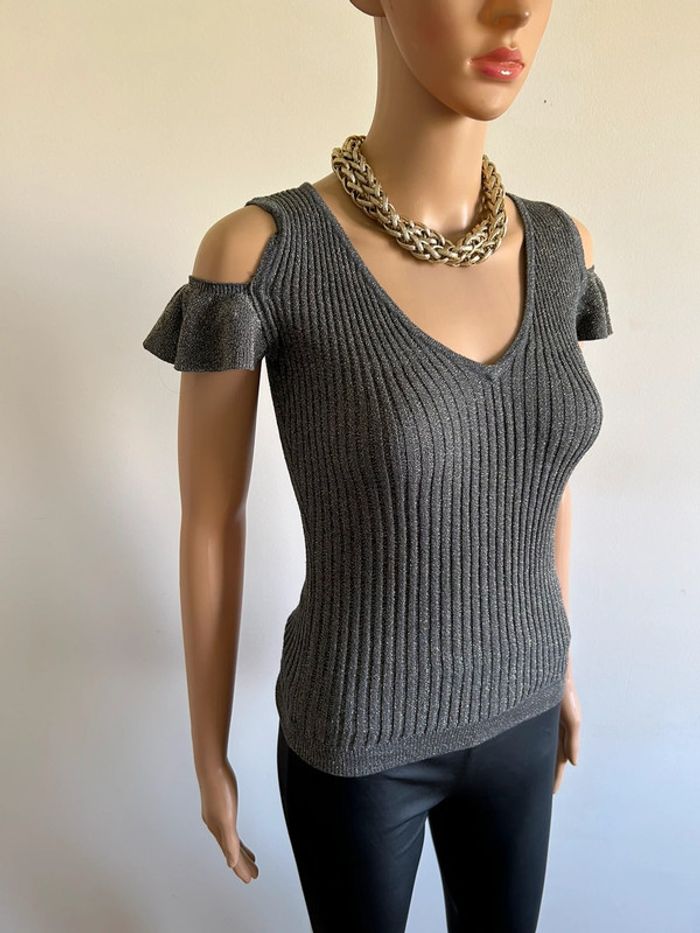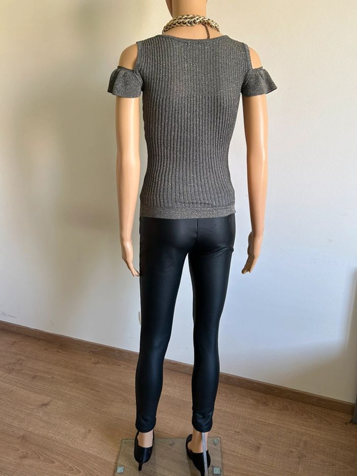 Joli haut gris pailleté à manches courtes, avec épaules dénudées, de marque Morgan. Taille S. Jamais porté, état neuf. aisselle à aisselle 32 cms à 42 cms taille 27 cms à 40 cms longueur depuis épaule 55 cms Le tissu est extensible Étiquette intérieure de composition coupée. Le prix reste négociable dans la limite du raisonnable. Un petit cadeau dans le colis 🌸 (Boîte 1)