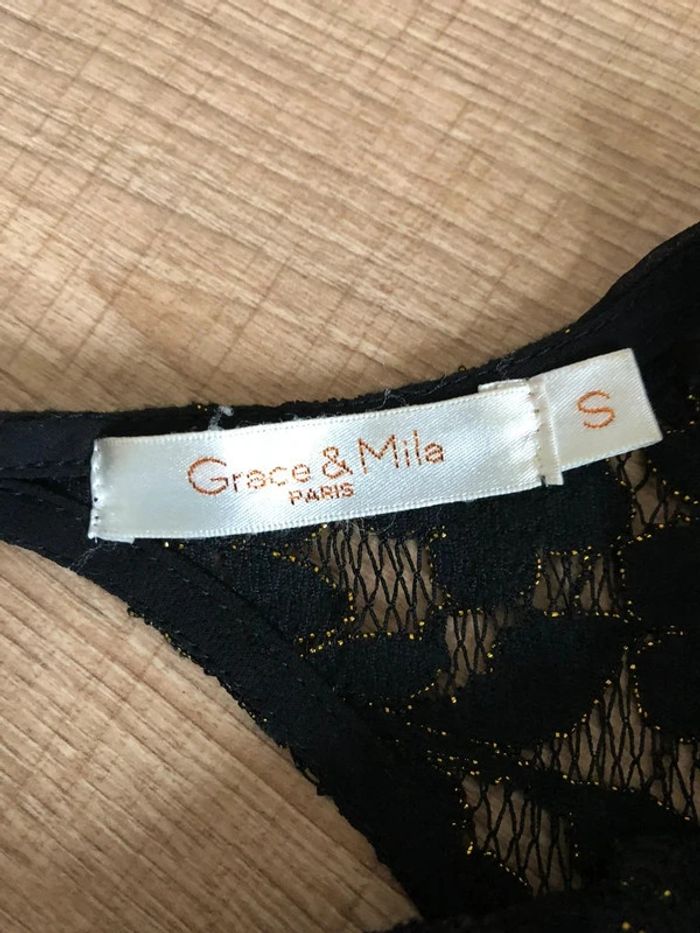 Robe noire et dorée avec dentelle, sans manches, de marque Grace & Mila. Taille S. Jamais portée, état neuf. aisselle à aisselle 50 cms taille 47 cms longueur depuis épaule 88 cms 100% polyester Le prix reste négociable dans la limite du raisonnable. Un petit cadeau dans le colis 🌸 (Boîte 38)