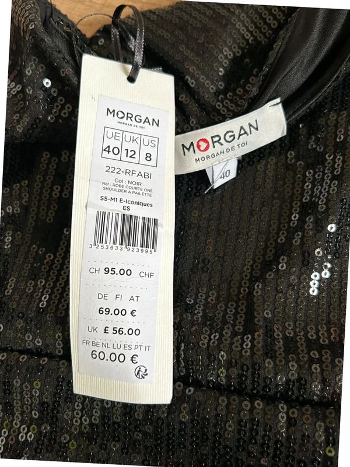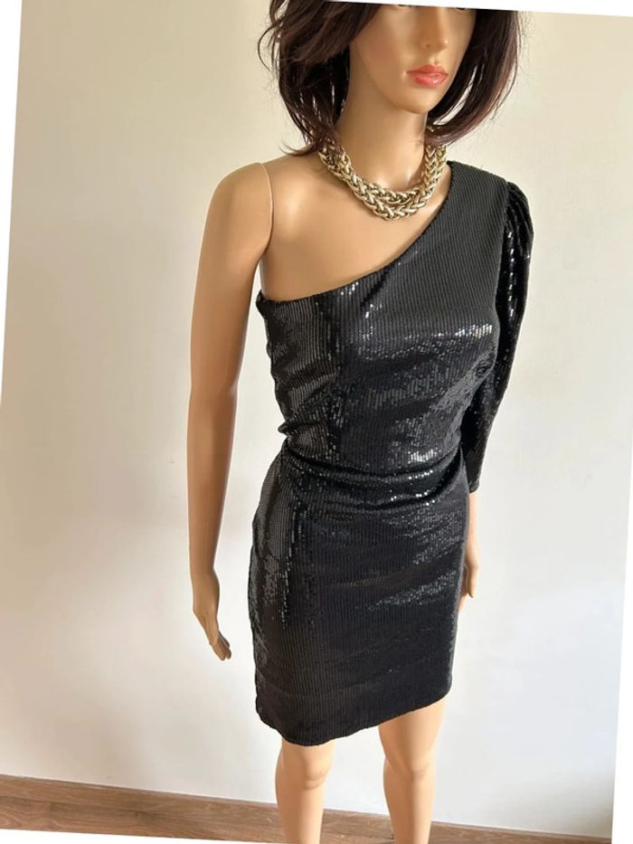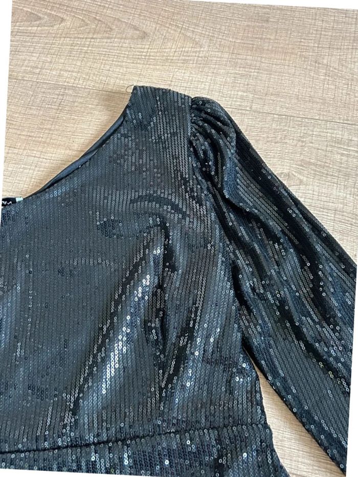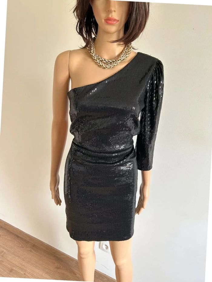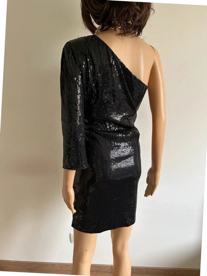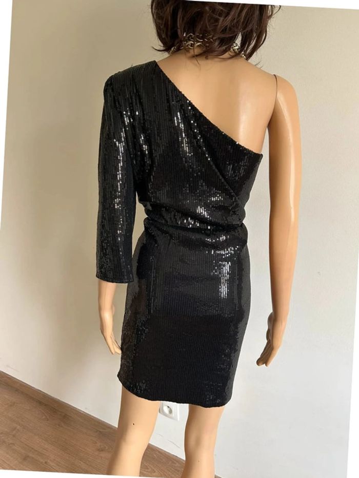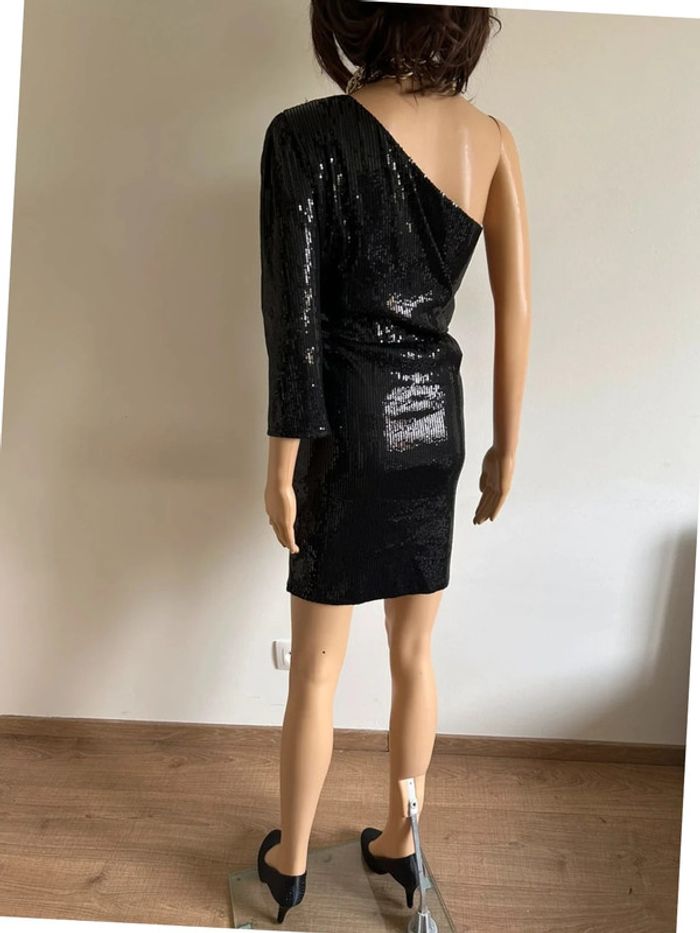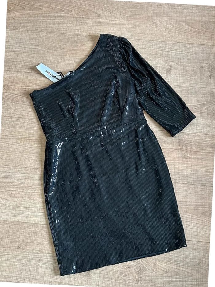 Magnifique robe noire en sequins, avec une épaule dénudée, de marque Morgan.