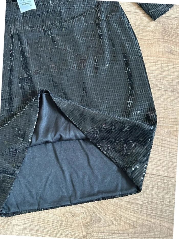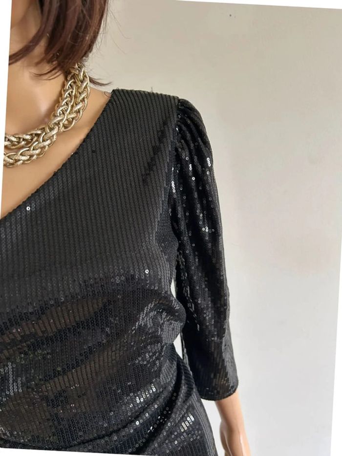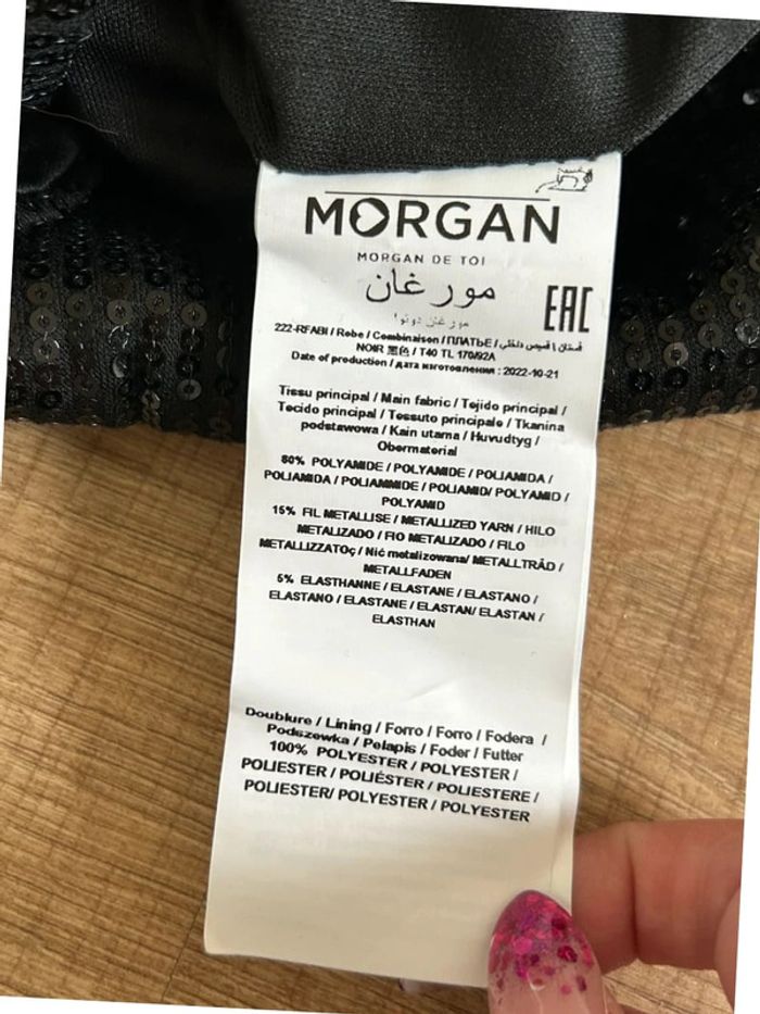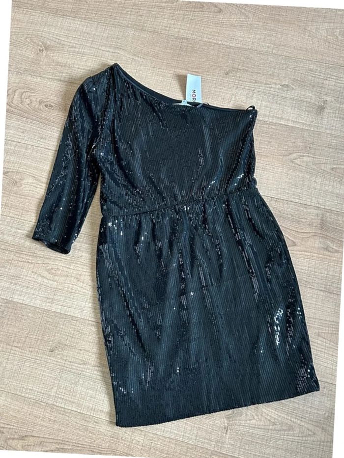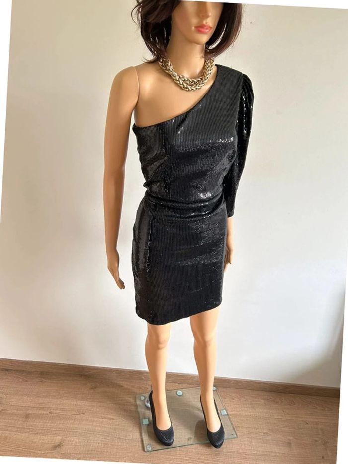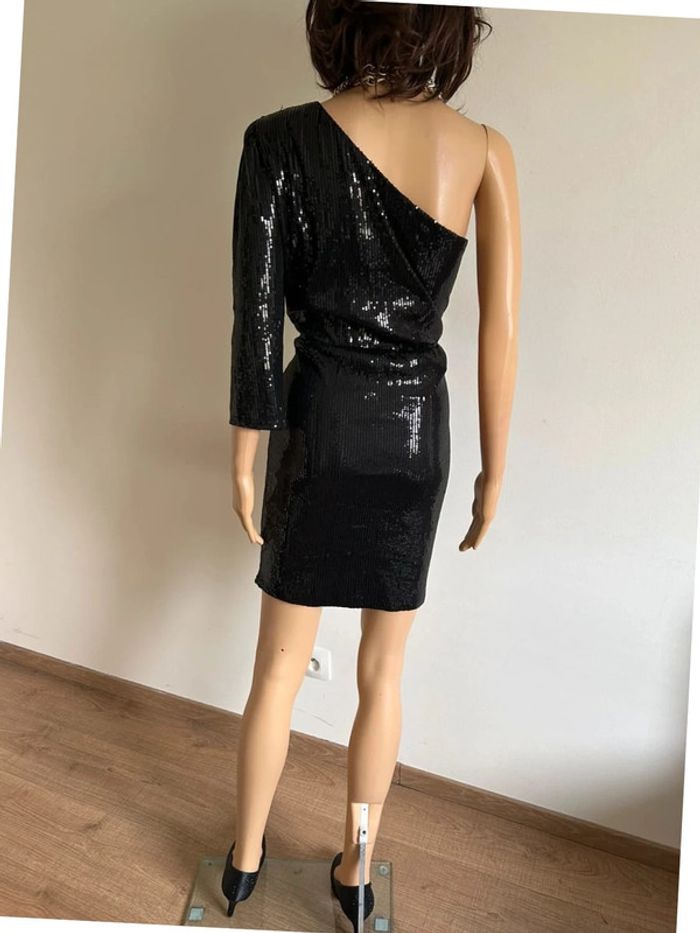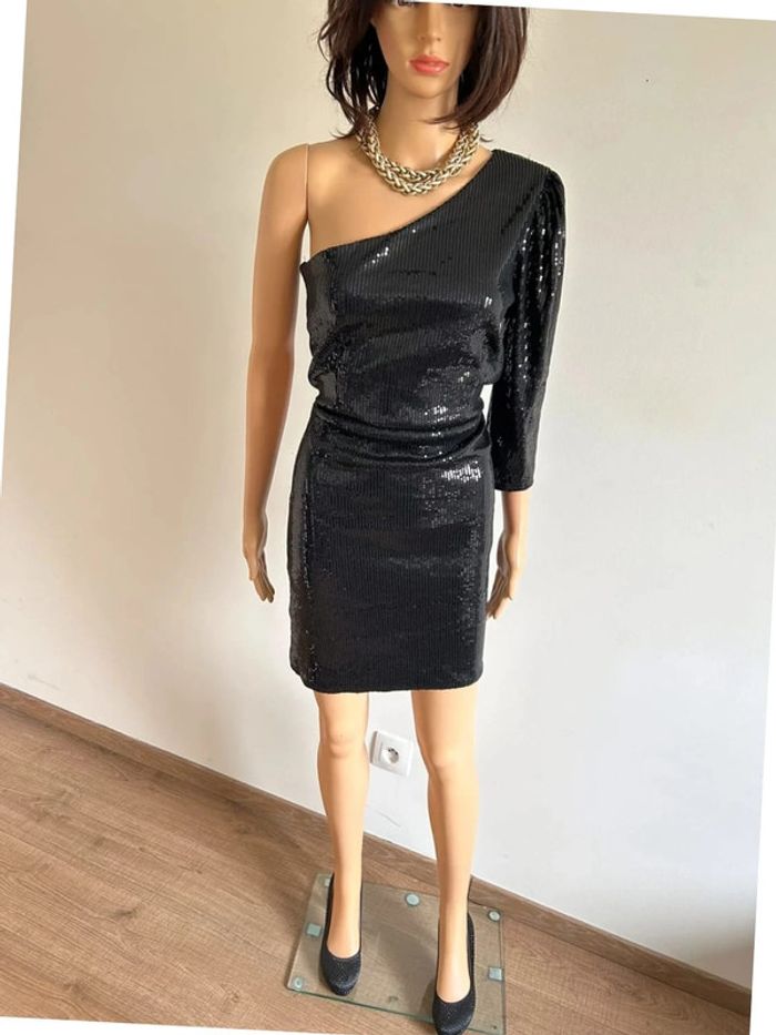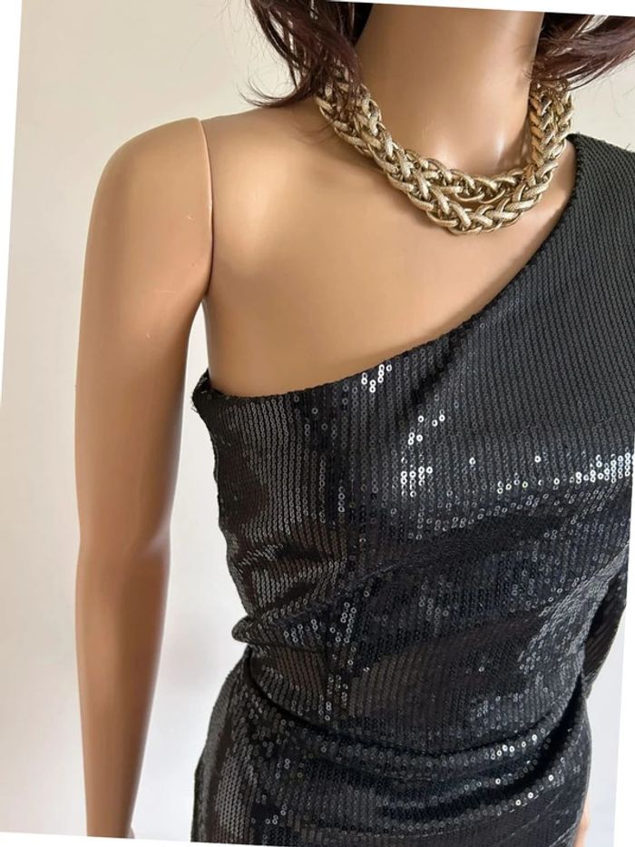 Magnifique robe noire en sequins, avec une épaule dénudée, de marque Morgan.