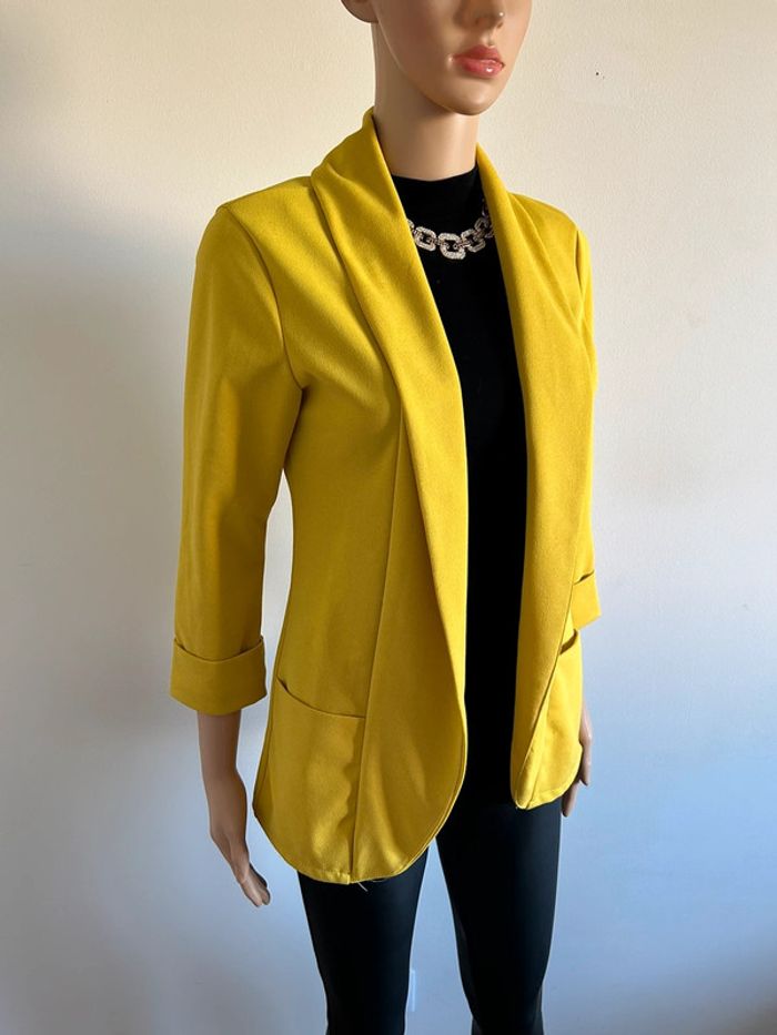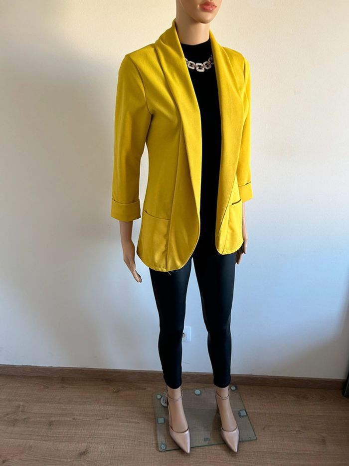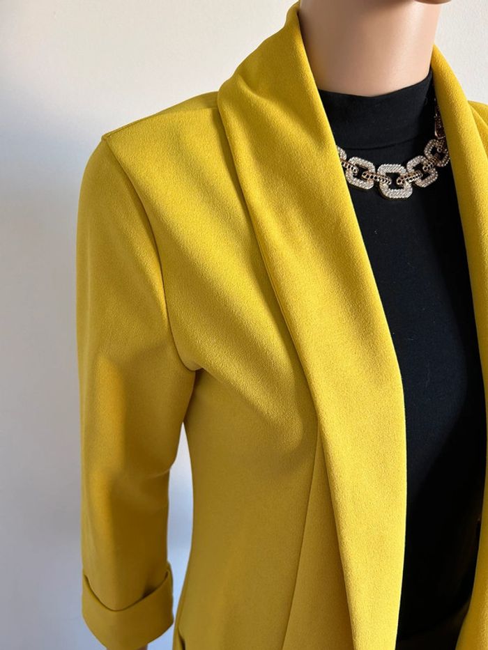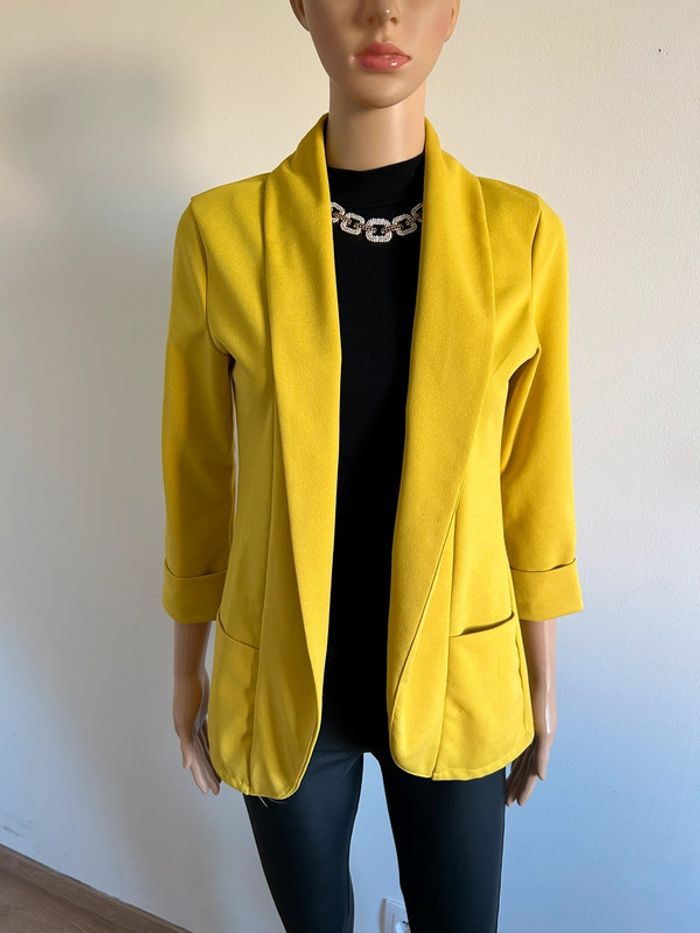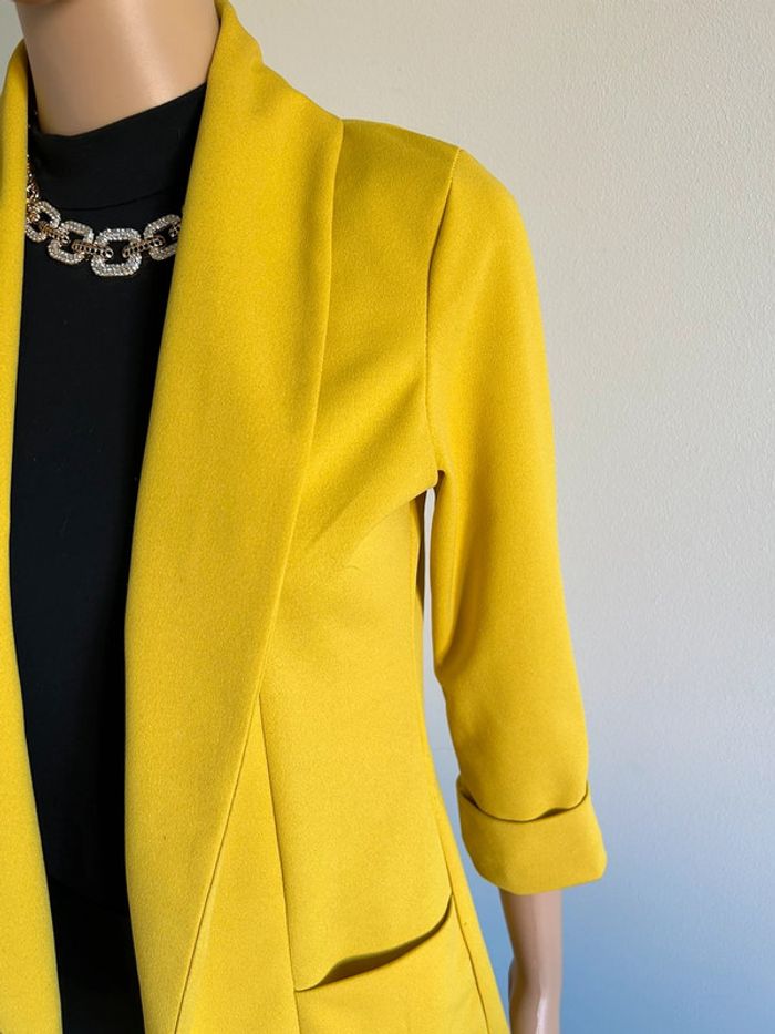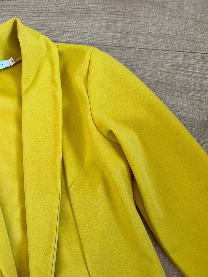 Blazer jaune pour femme, de marque LolaLiza. Pas de système de fermeture, se porte ouvert. Taille 36. Jamais porté, état neuf. aisselle à aisselle 45 cms et plus épaule à épaule 39 cms et plus longueur manches 46 cms taille 43 cms et plus longueur depuis épaule 65 cms Le tissu est extensible Étiquette intérieure de composition coupée. Le prix reste négociable dans la limite du raisonnable. Un petit cadeau dans le colis 🌸