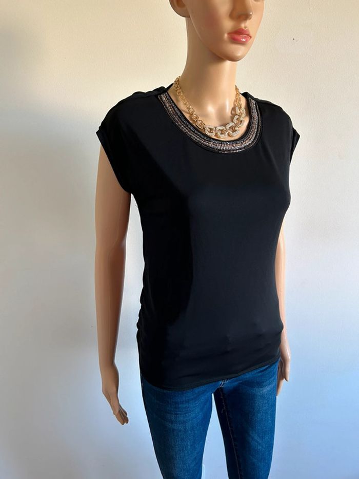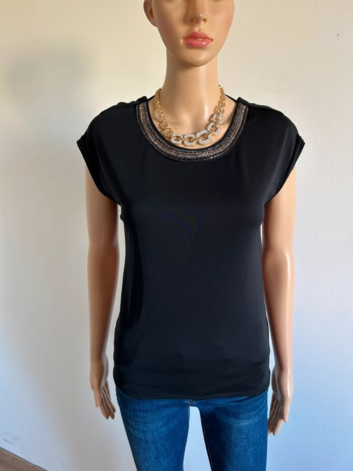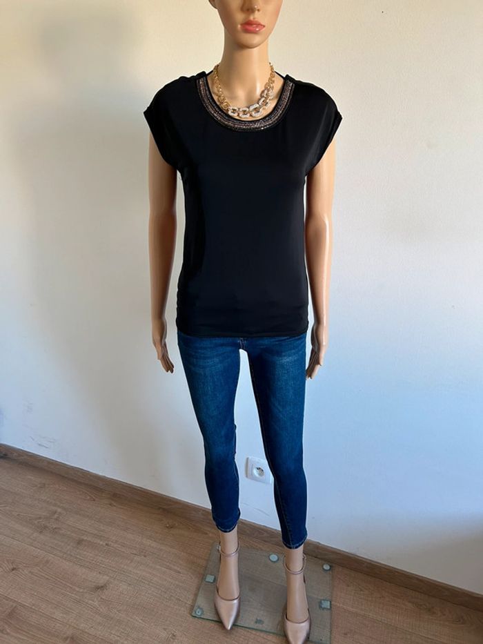 Magnifique blouse noire à manches courtes, de marque LolaLiza. Perles au niveau de l’encolure et dentelle dans le dos. Taille 36. Jamais portée, état neuf. aisselle à aisselle 41 cms et plus taille 41 cms et plus longueur depuis épaule 60 cms Le tissu est extensible 95% polyester et 5% elasthanne Le prix reste négociable dans la limite du raisonnable. Un petit cadeau dans le colis 🌸 (Boîte 8)