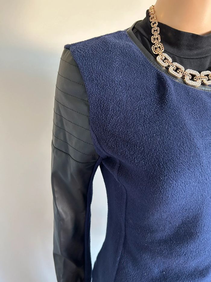 Jolie veste bleue marine et noire, avec manches en simili cuir, de marque IKKS. Taille 38. Portée plusieurs fois, en très bon état. aisselle à aisselle 48 cms et plus épaule à épaule 35 cms et plus longueur manches 60 cms taille 41 cms et plus longueur depuis épaule 57 cms Le tissu est extensible 73% polyester et 27% polyuréthane Le prix reste négociable dans la limite du raisonnable. Un petit cadeau dans le colis 🌸