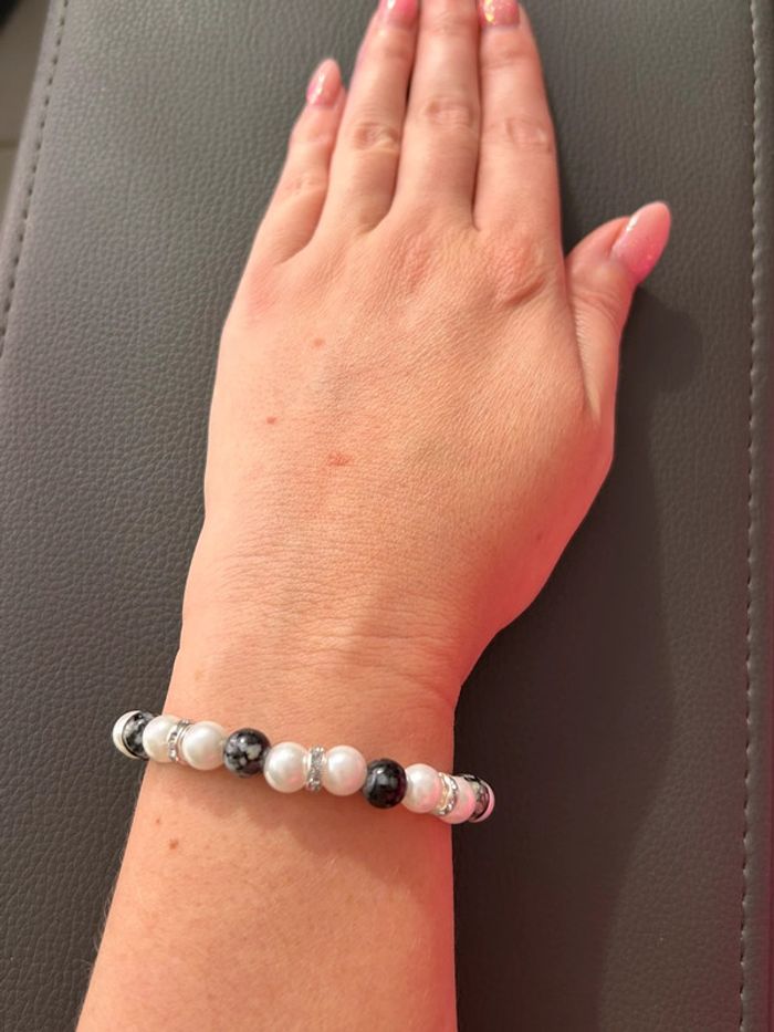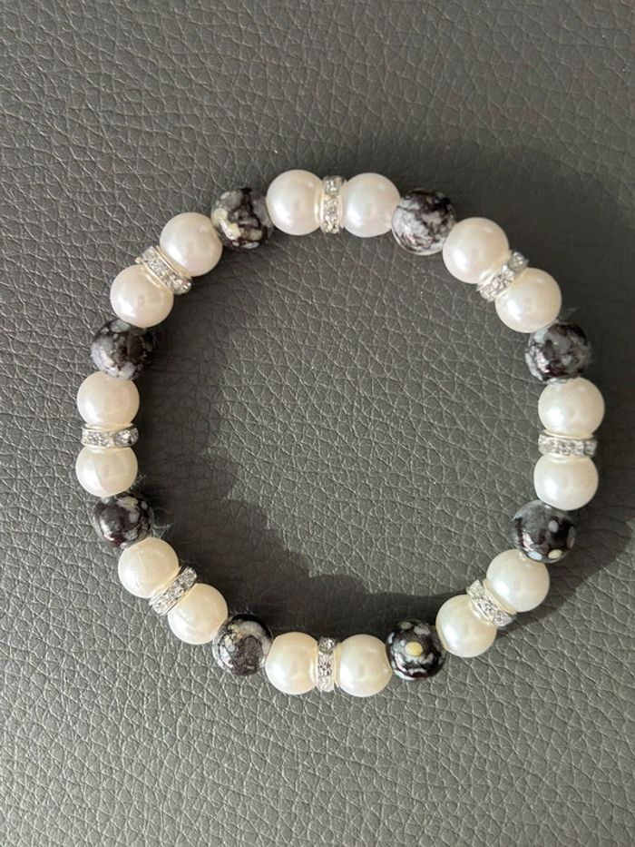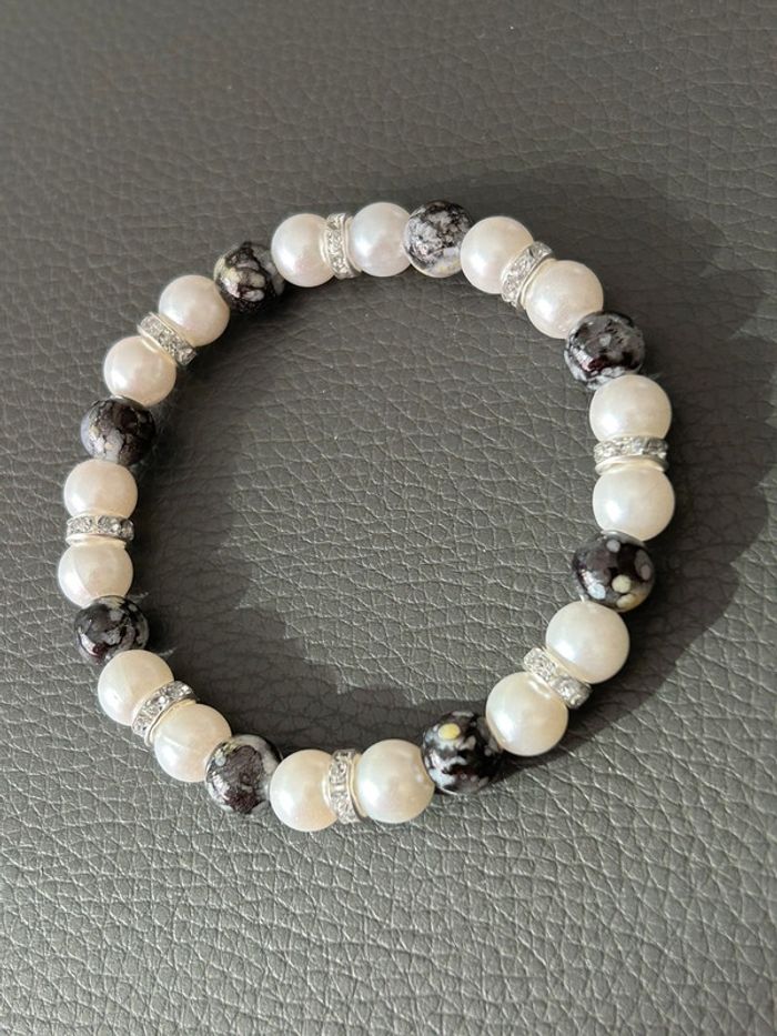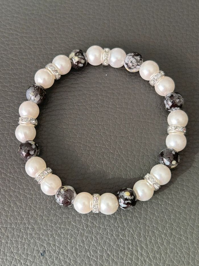 Joli bracelet nacré et noir en perles. Taille unique car élastique. Jamais porté, état neuf.