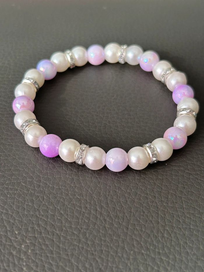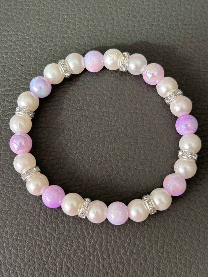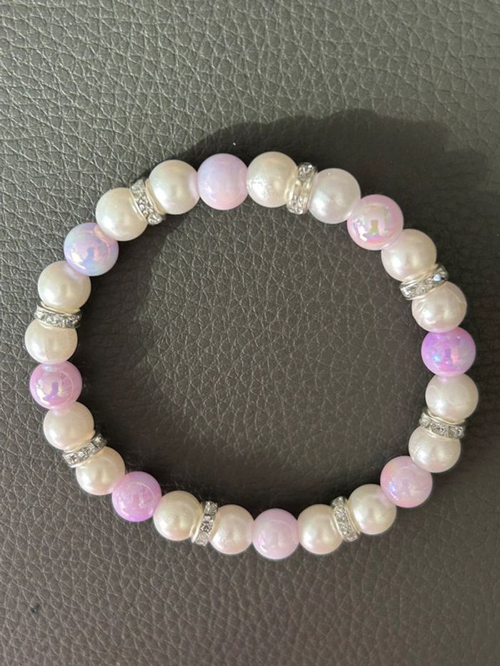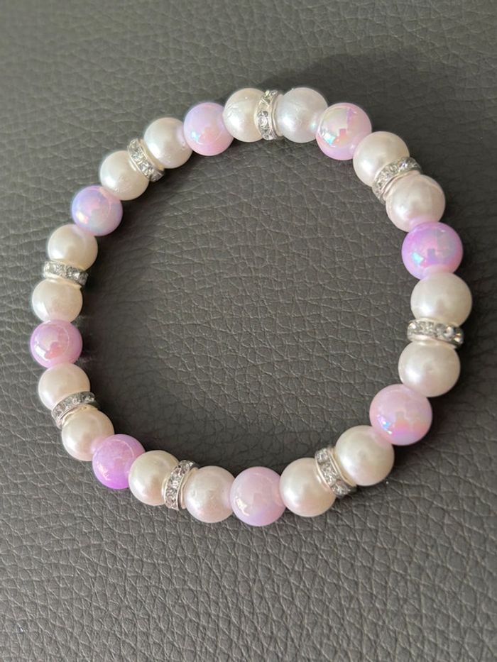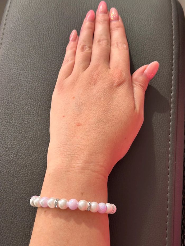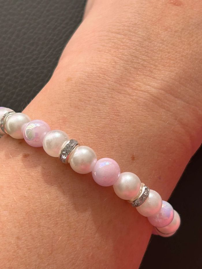 Joli bracelet nacré et rose en perles. Taille unique car élastique. Jamais porté, état neuf.