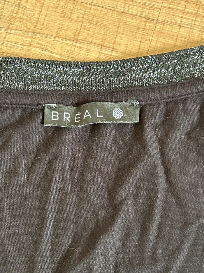 Jolie blouse noire et pailletée argentée, à manches courtes, de marque Breal. Correspond à une taille L (étiquette de taille coupée, voir mesures en dessous). Peu portée, en très bon état. aisselle à aisselle 56 cms taille 52 cms longueur depuis épaule 57 cms Étiquette intérieure de composition coupée (Boîte 7)