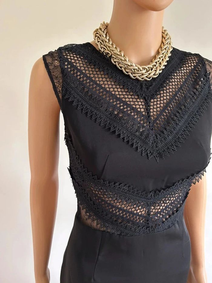 Magnifique robe noire sans manches, avec empiècements transparents en dentelle, de marque Morgan. Fermeture sur le côté. Taille 34. Elle est neuve avec étiquette (valeur 85€). aisselle à aisselle 40 cms taille 33 cms longueur depuis épaule 88 cms 100% polyester Un petit cadeau dans le colis 🌸 (Boîte 9)