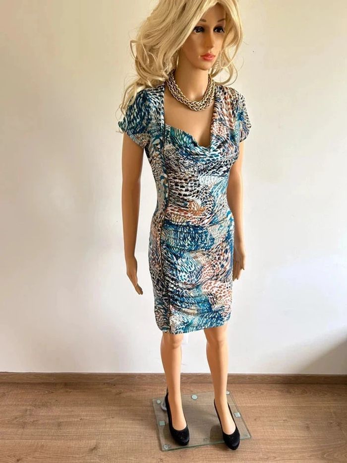 Magnifique robe imprimée à manches courtes, de marque Morgan. Taille XS. Jamais portée, état neuf. aisselle à aisselle 39 cms à 52 cms épaule à épaule 33 cms à 40 cms taille 32 cms à 40 cms longueur depuis épaule 92 cms Le tissu est extensible Étiquette intérieure de composition coupée Le prix reste négociable dans la limite du raisonnable. Un petit cadeau dans le colis (Boîte 10)