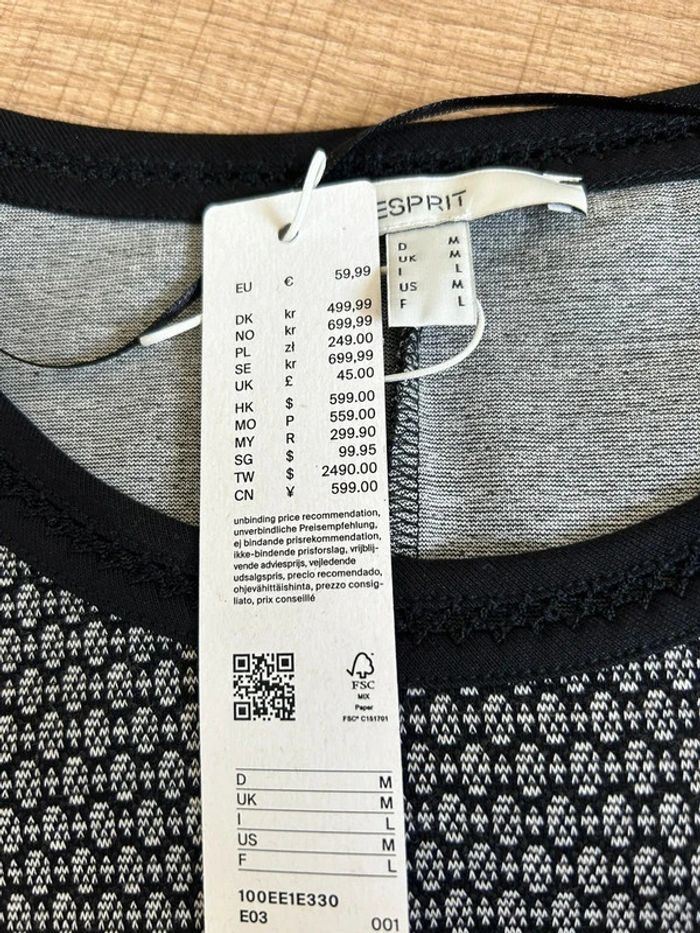 Jolie robe noire et grise avec manches 3/4, de marque Esprit. Taille L. Elle est neuve avec étiquette (valeur 60€). aisselle à aisselle 43 cms à 49 cms épaule à épaule 38 cms à 44 cms taille 38 cms à 41 cms longueur depuis épaule 95 cms Le tissu est extensible 82% coton, 16% polyester et 2% elasthanne Un petit cadeau dans le colis 🌸 (Boîte 17)