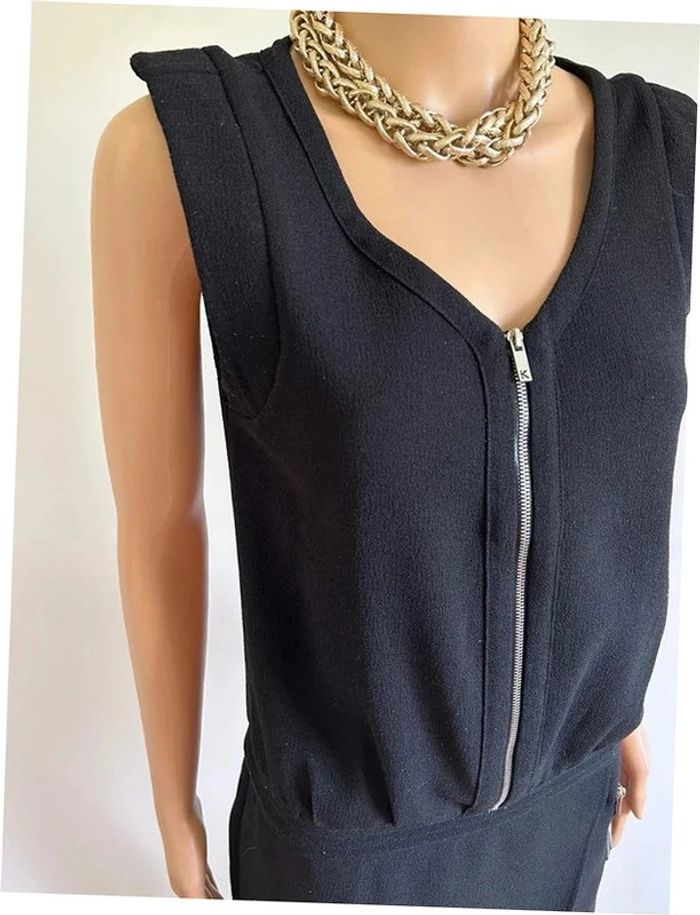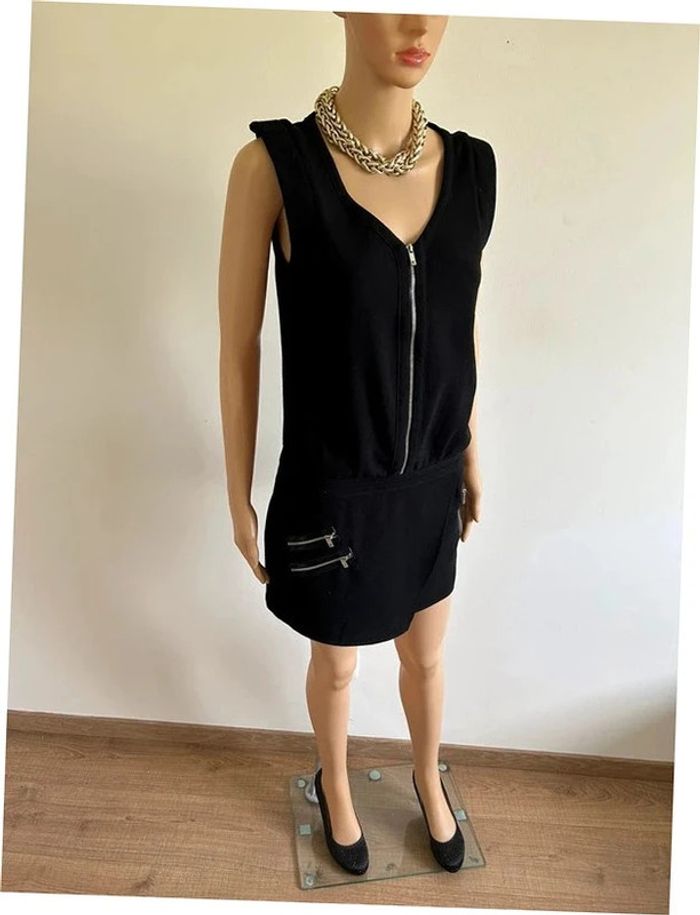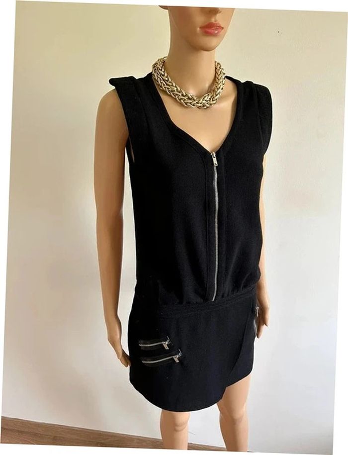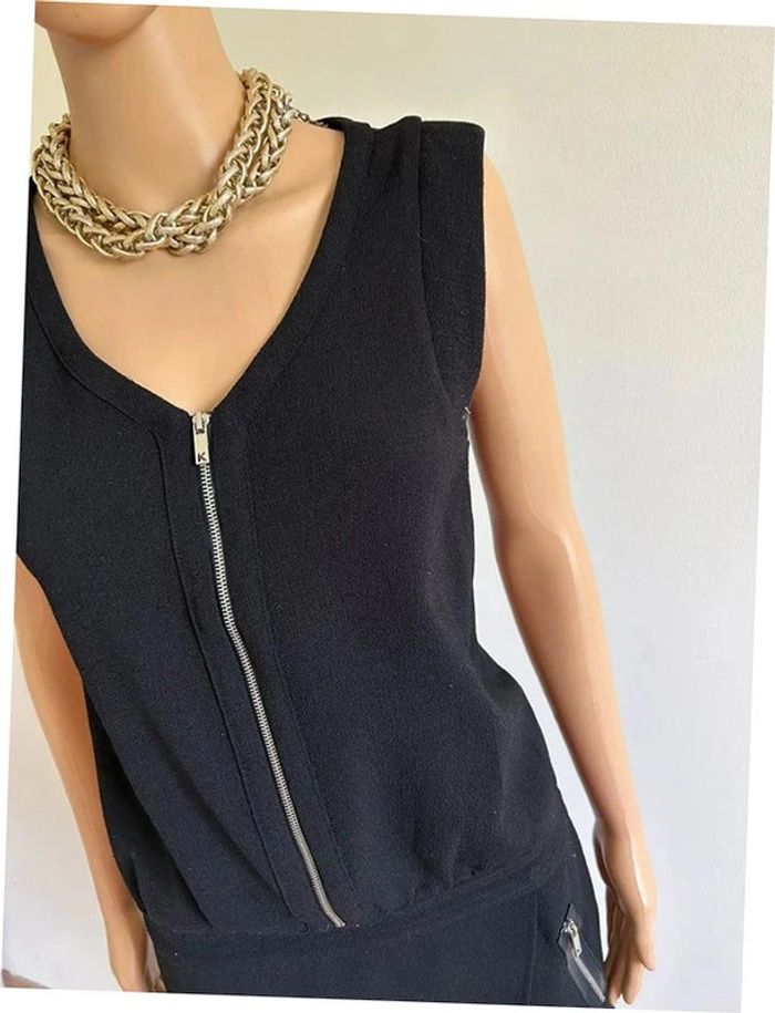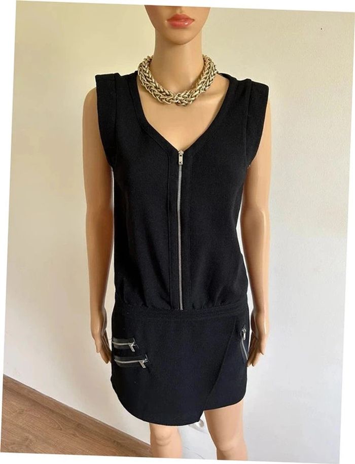Jolie robe courte noire ou tunique, sans manches, avec zips argentés, de marque Kookai. Fermeture sur le côté. Taille 38. Portée quelques fois, en très bon état. aisselle à aisselle 44 cms taille 42 cms longueur depuis épaule 82 cms Étiquette intérieure de composition coupée Le prix reste négociable dans la limite du raisonnable. Un petit cadeau dans le colis 🌸 (Boîte 46)