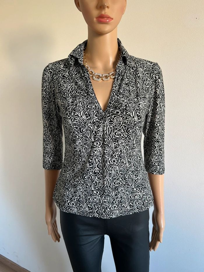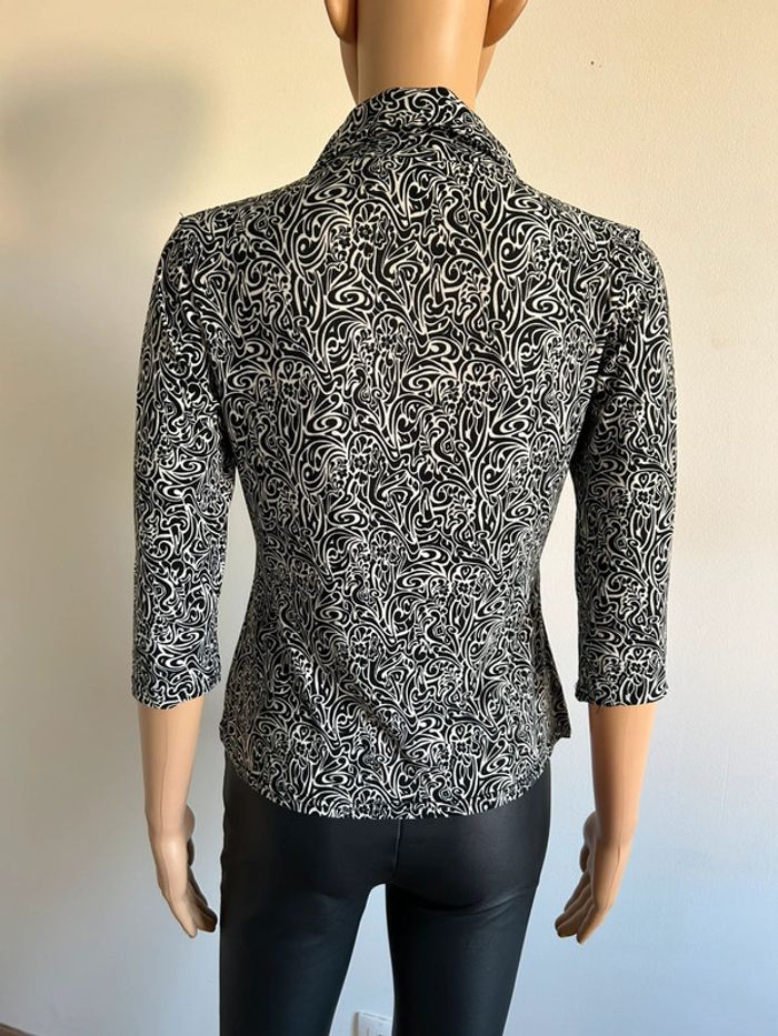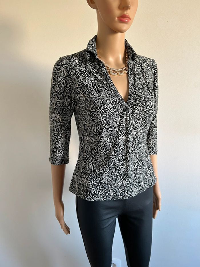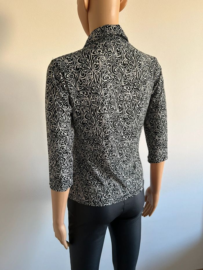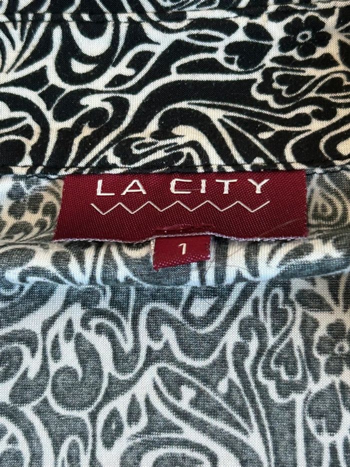 Joli haut noir et blanc avec manches courtes, de marque La City. Taille 1 qui correspond à du 36. Porté souvent, en bon état. aisselle à aisselle 41 cms et plus épaule à épaule 37 cms et plus taille 37 cms et plus longueur depuis épaule 50 cms Le tissu est extensible 92% polyester et 8% elasthanne (Boîte 7)
