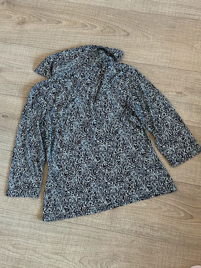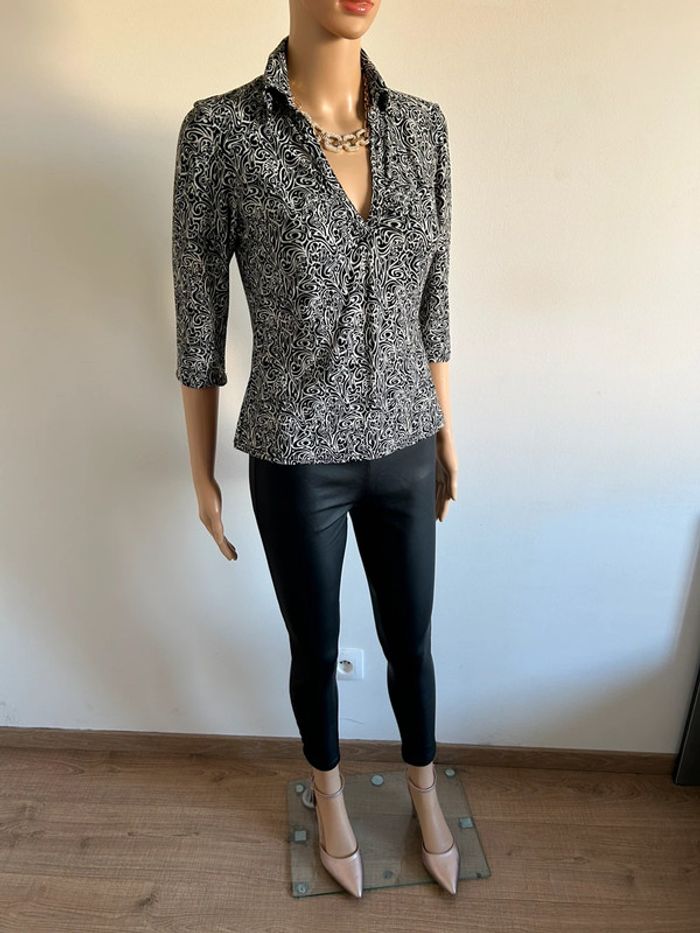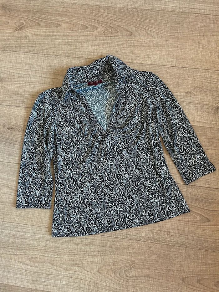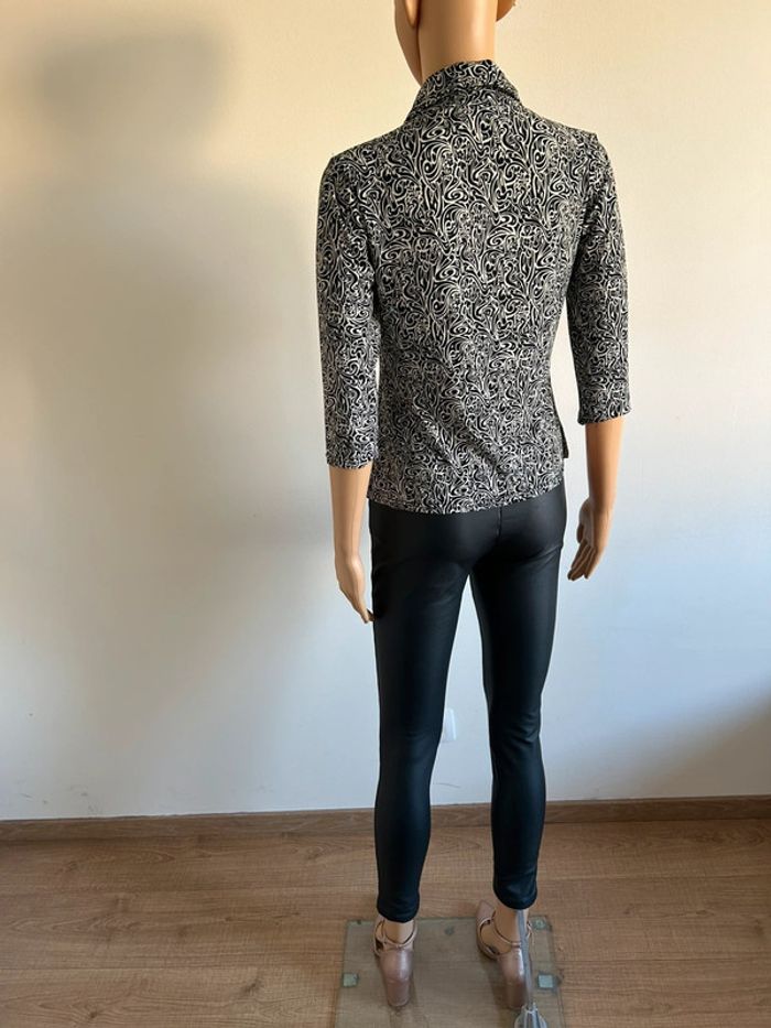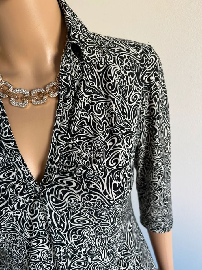 Joli haut noir et blanc avec manches courtes, de marque La City. Taille 1 qui correspond à du 36. Porté souvent, en bon état. aisselle à aisselle 41 cms et plus épaule à épaule 37 cms et plus taille 37 cms et plus longueur depuis épaule 50 cms Le tissu est extensible 92% polyester et 8% elasthanne (Boîte 7)