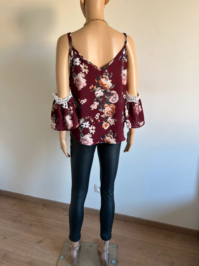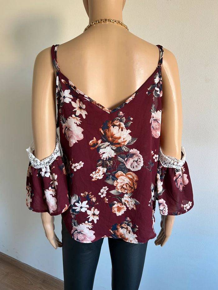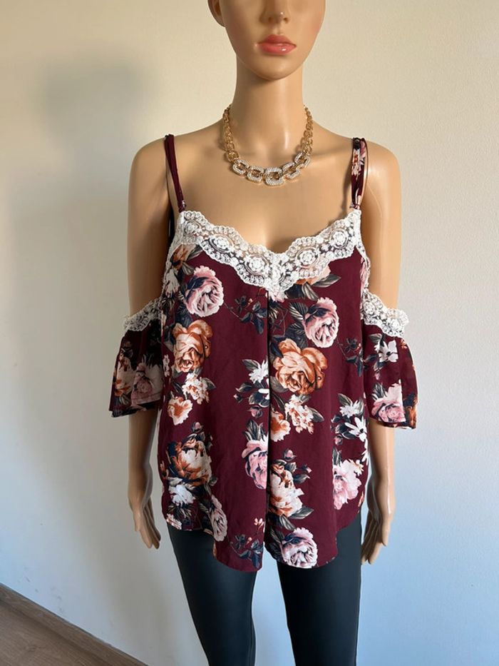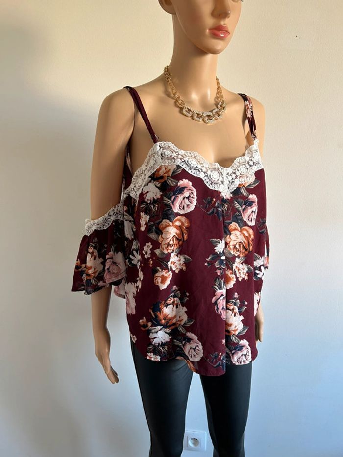 Jolie blouse bordeaux et fleurie avec épaules dénudées, de marque Ardene. Taille L. Portée quelques fois, en très bon état. aisselle à aisselle 50 cms taille 53 cms longueur depuis épaule 57 cms Pas d’étiquette intérieure de composition Le prix reste négociable dans la limite du raisonnable. Un petit cadeau dans le colis 🌸 (Boîte 8)