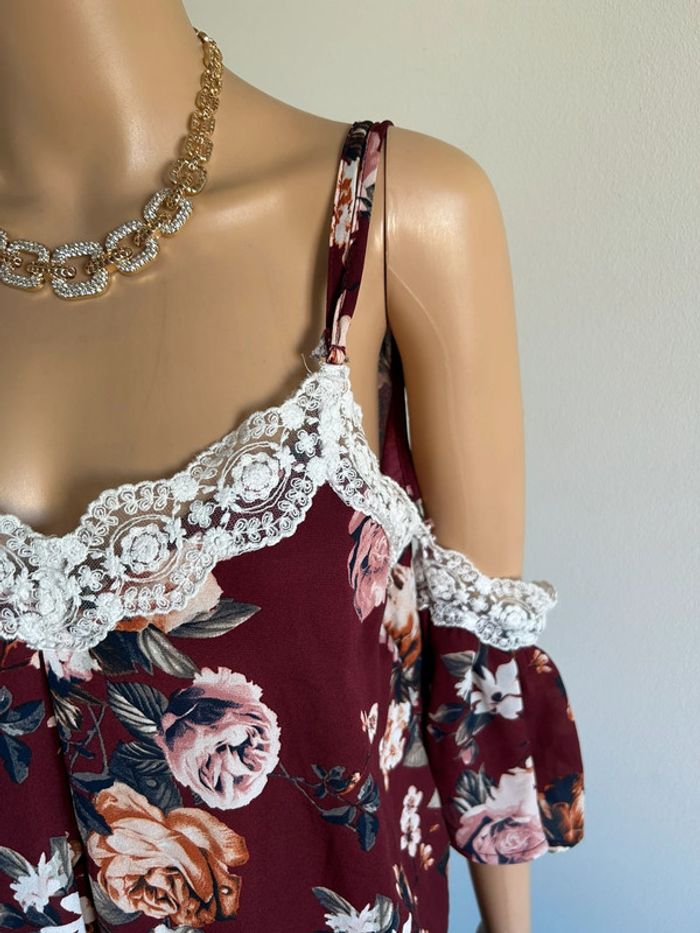 Blouse bordeaux et fleurie avec dentelle Ardene taille L TBE - photo numéro 2