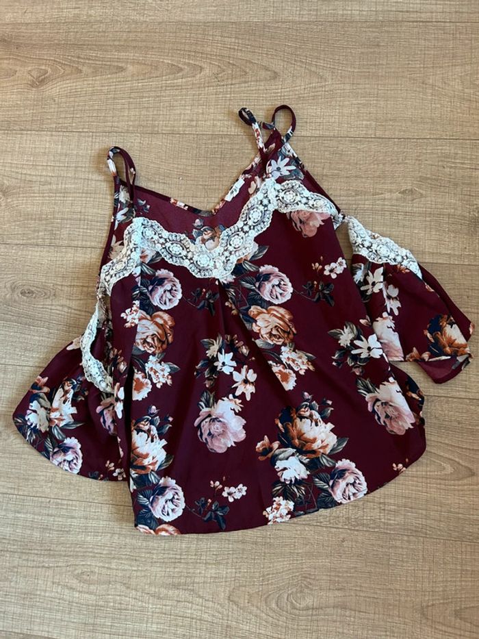 Blouse bordeaux et fleurie avec dentelle Ardene taille L TBE - photo numéro 1