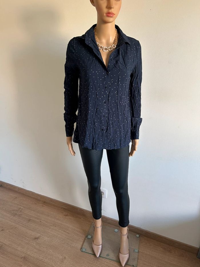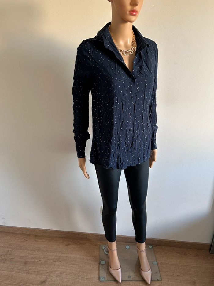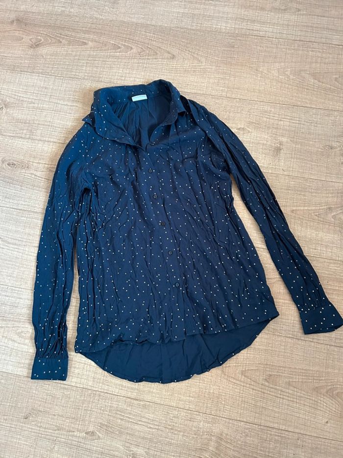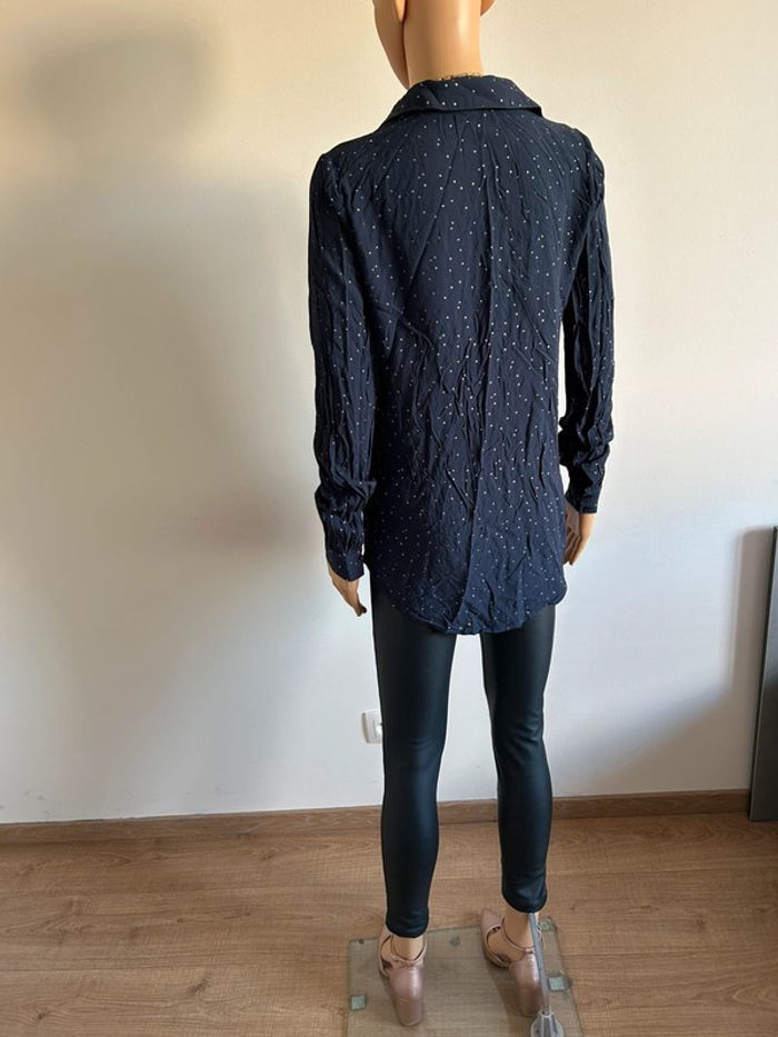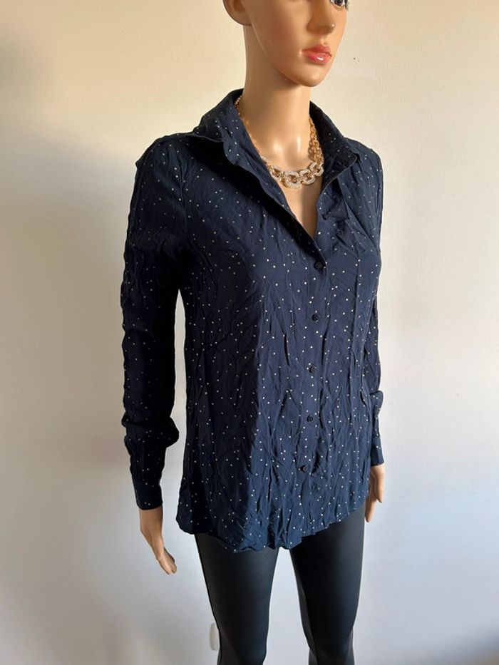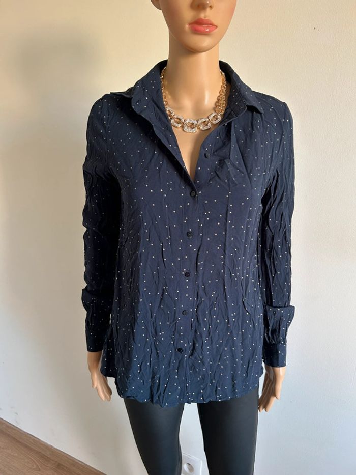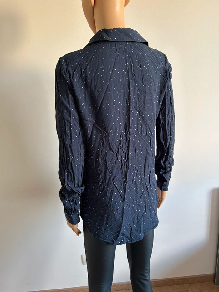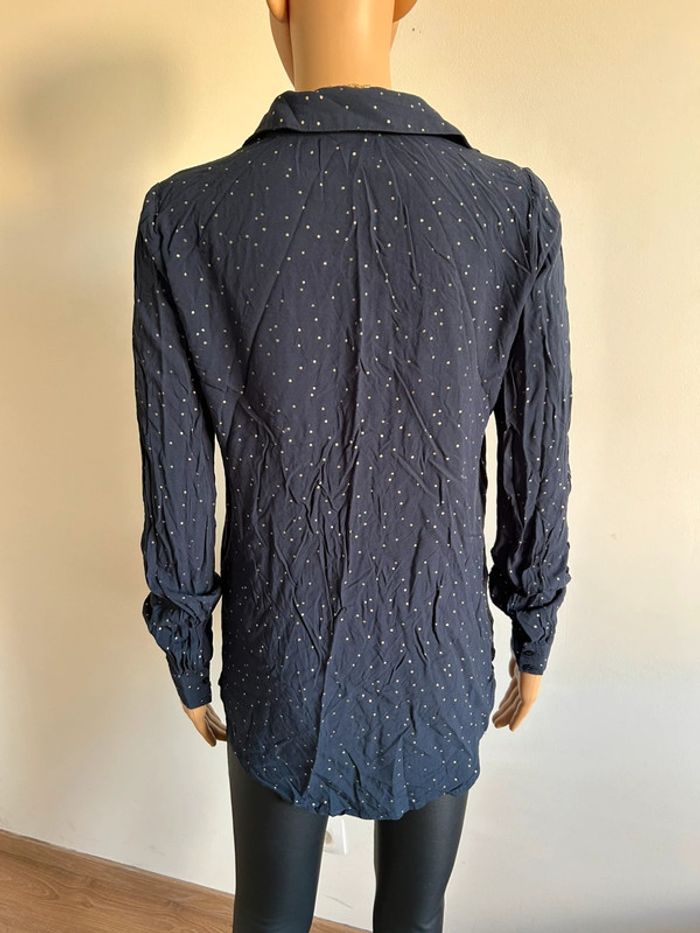 Jolie chemise bleue marine à manches longues, avec pois dorés, de marque Vila. Taille 34. Peu portée, en très bon état. aisselle à aisselle 47 cms épaule à épaule 37 cms longueur manches 63 cms taille 42 cms longueur depuis épaule 61 cms à 68 cms 100% viscose Le prix reste négociable dans la limite du raisonnable. Un petit cadeau dans le colis 🌸 (Boîte 6)