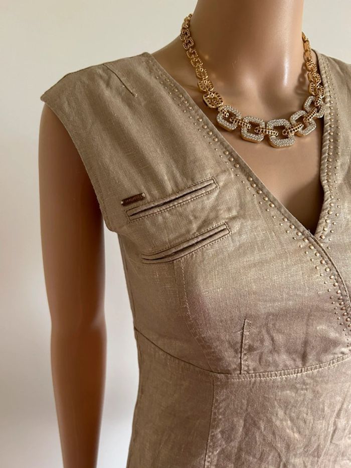 Jolie robe beige dorée en lin, sans manches, de marque IKKS. Fermeture sur le côté. Taille 34 mais elle taille petit. Jamais portée, état neuf. aisselle à aisselle 41 cms taille 32 cms longueur depuis épaule 90 cms 100% lin Le prix reste négociable dans la limite du raisonnable. Un petit cadeau dans le colis 🌸 (Boîte 14)