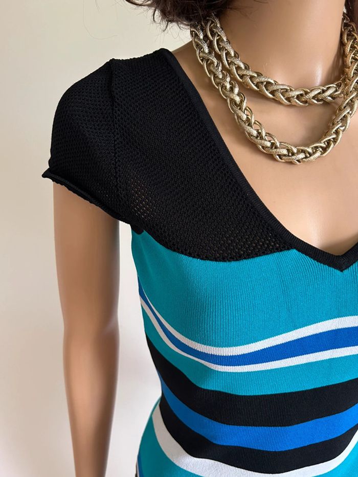 Magnifique robe rayée turquoise noire et blanche, à manches courtes, de marque Morgan. Taille S. Jamais portée, état neuf. aisselle à aisselle 38 cms à 47 cms épaule à épaule 30 cms à 36 cms taille 34 cms à 40 cms longueur depuis épaule 89 cms Le tissu est extensible Étiquette intérieure de composition coupée Le prix reste négociable dans la limite du raisonnable. Un petit cadeau dans le colis 🌸 (Boîte 36)