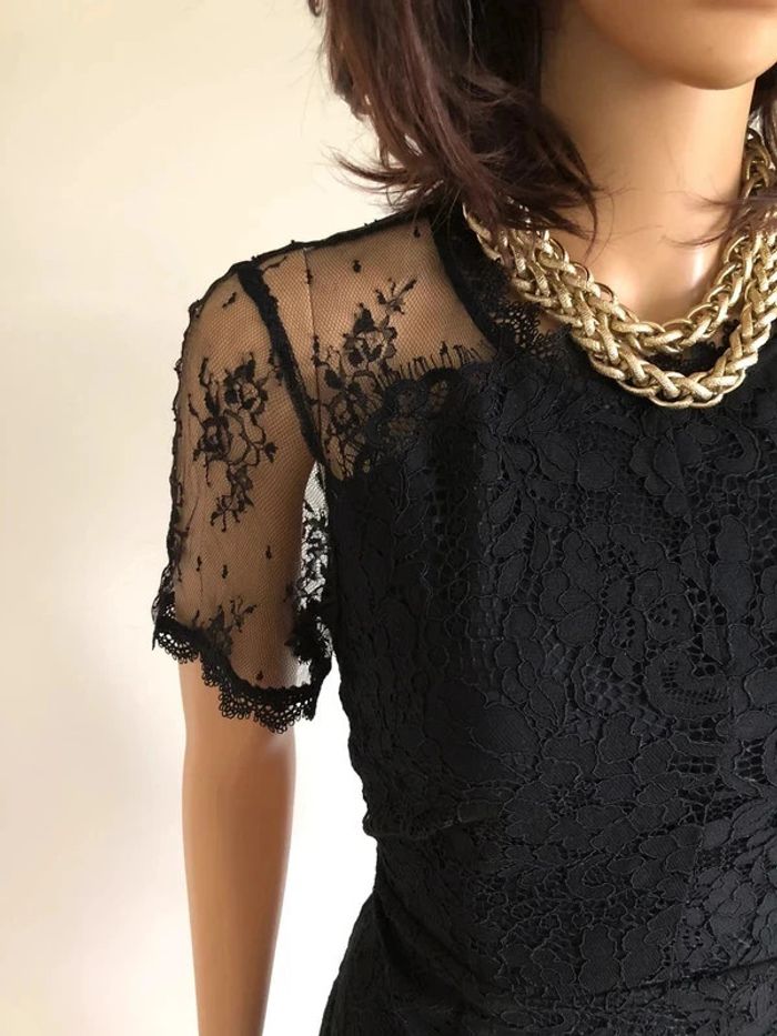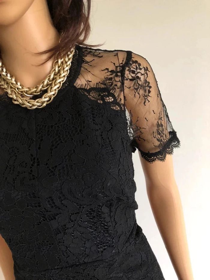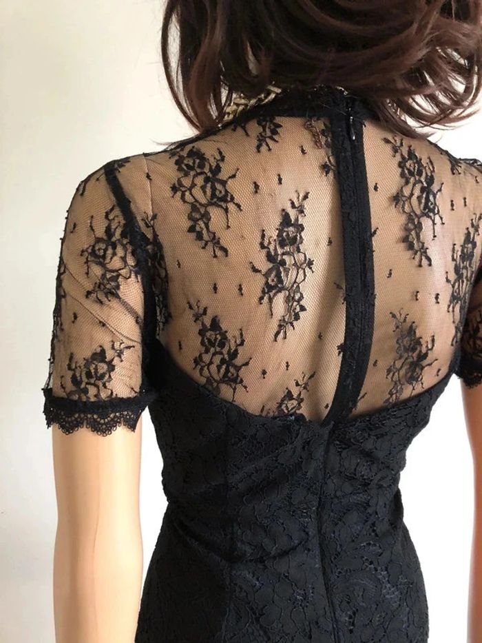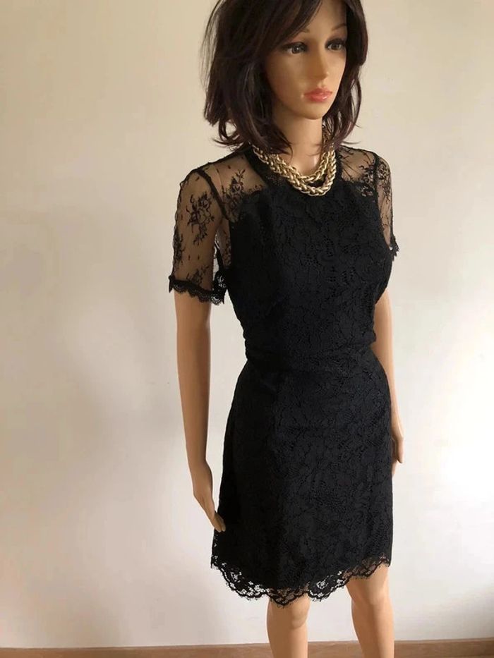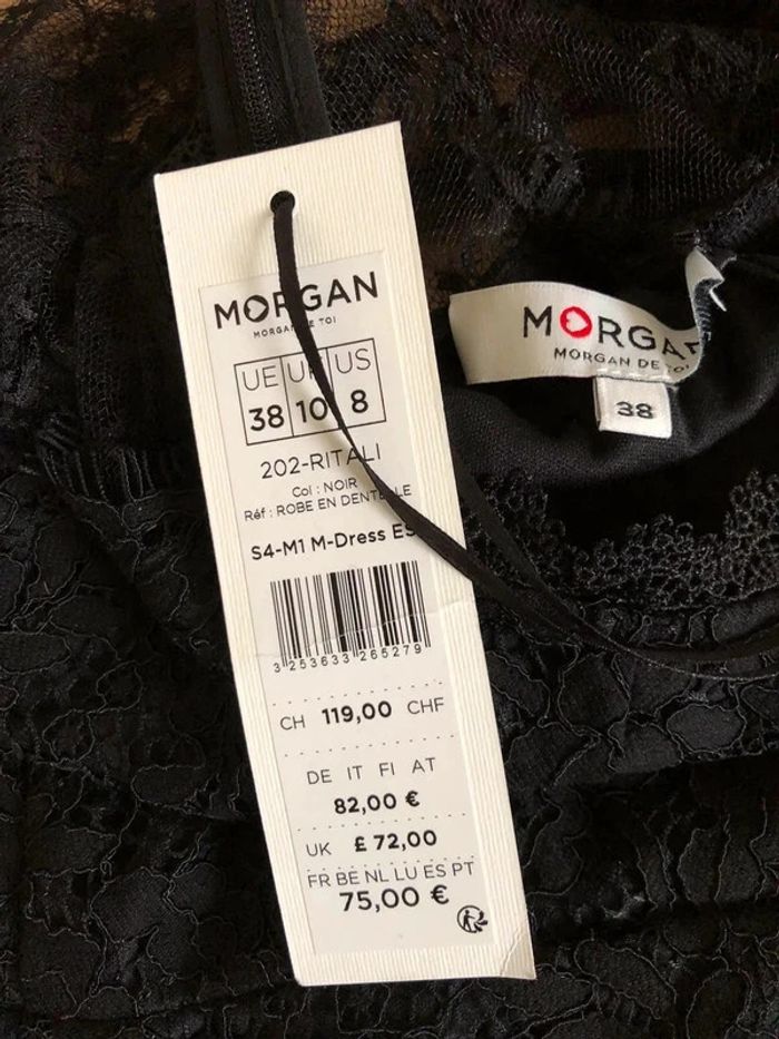 Robe noire en dentelle , à manches courtes, de marque Morgan. Taille 38. Fermeture dans le dos. Elle est neuve avec étiquette (valeur 75€). aisselle à aisselle 43 cms épaule à épaule 38 cms taille 38 cms longueur depuis épaule 92 cms 70% polyamide et 30% coton Le prix reste négociable dans la limite du raisonnable. Un petit cadeau dans le colis.