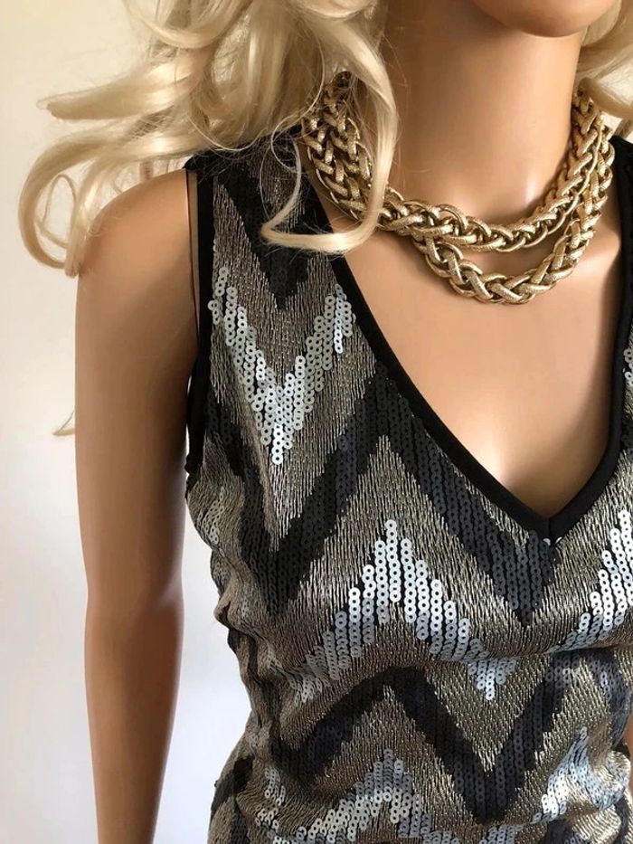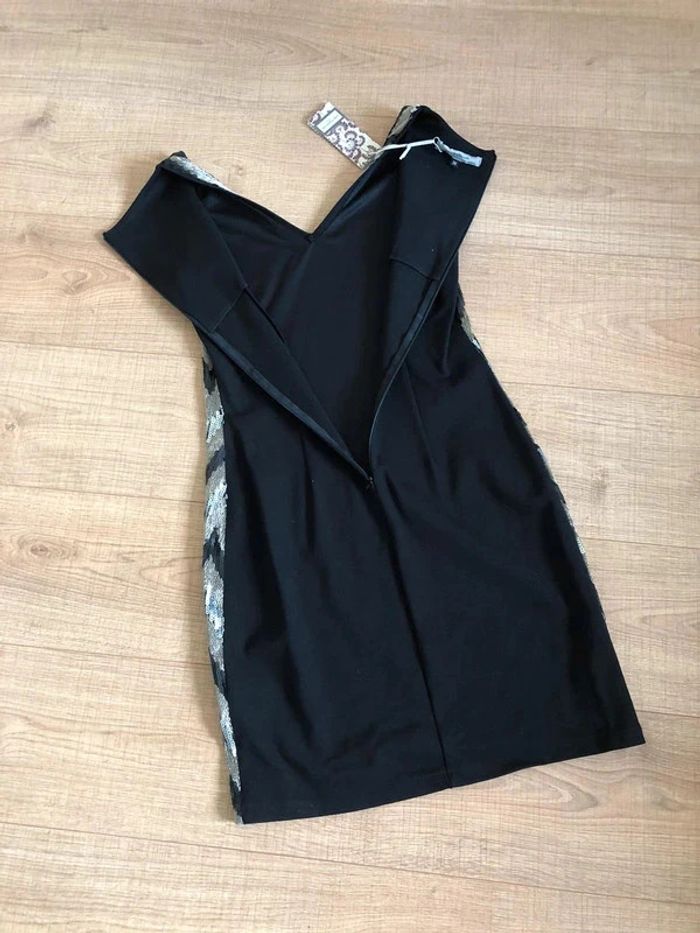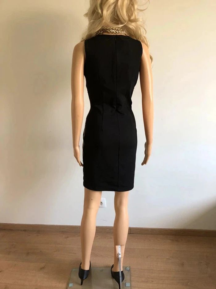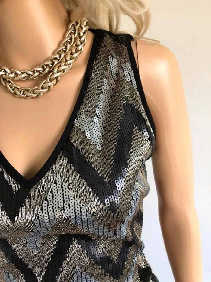 Magnifique robe sans manches, noire derrière, sequins noirs et argentés et fils dorés sur le devant, de marque La Fée Maraboutée. Fermeture dans le dos. Taille 38. Elle est neuve avec étiquette. aisselle à aisselle 45 cms taille 38 cms longueur depuis épaule 89 cms Le tissu est extensible 100% polyester Le prix reste négociable dans la limite du raisonnable. Un petit cadeau dans le colis. (Boîte 27)