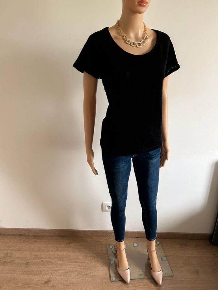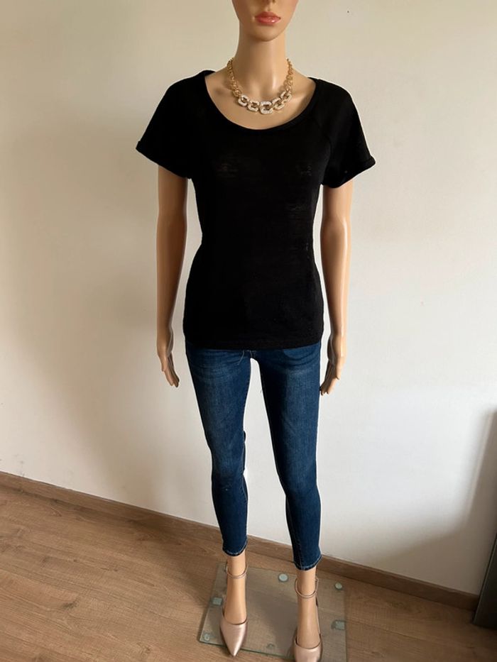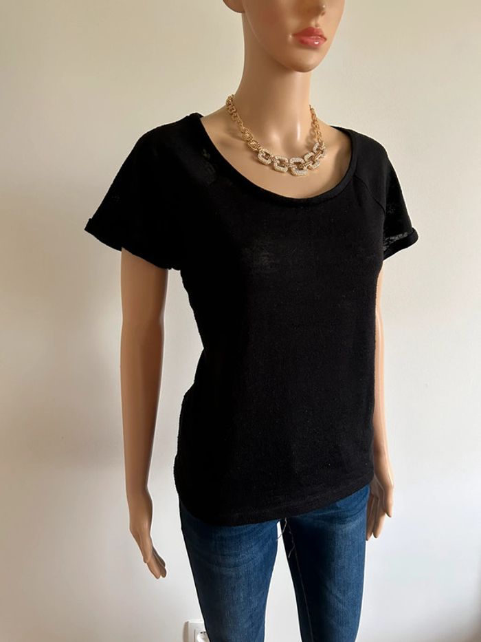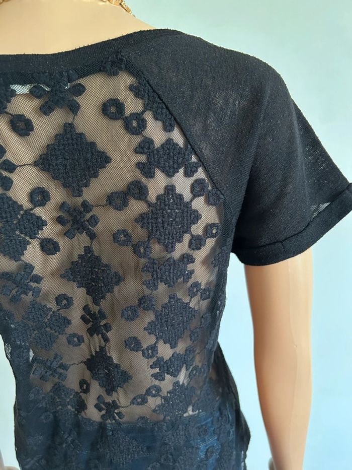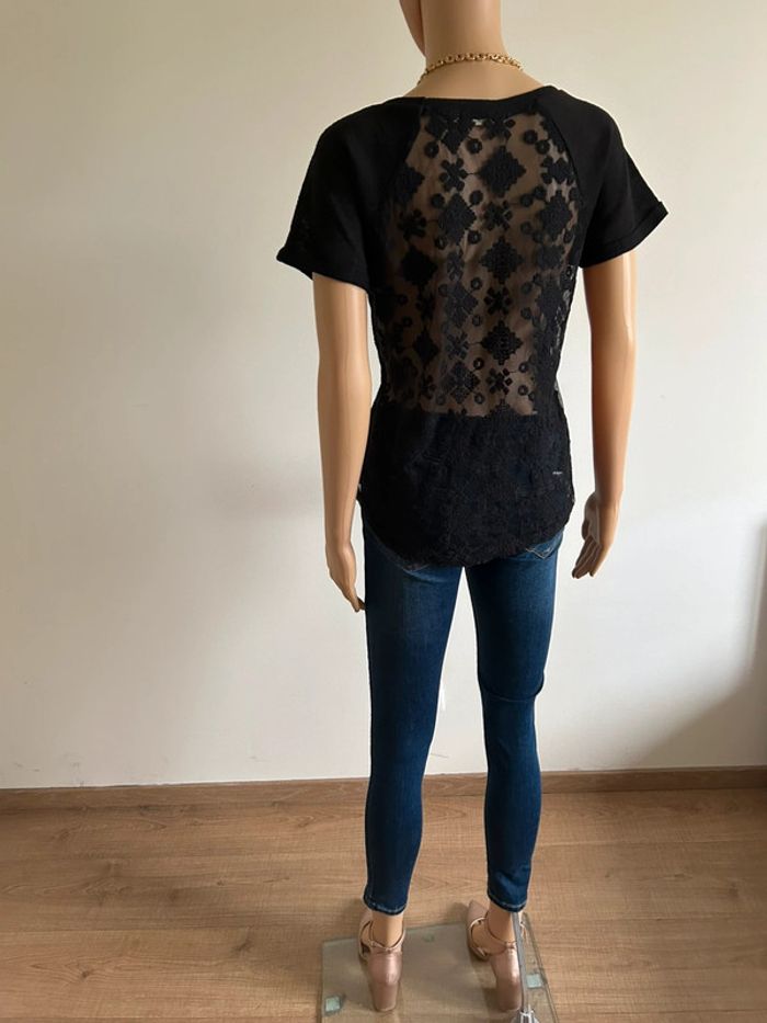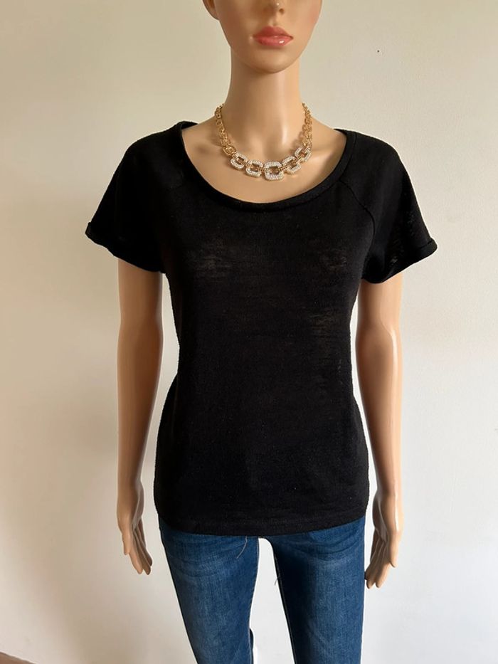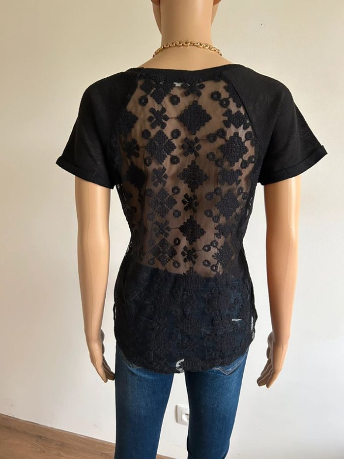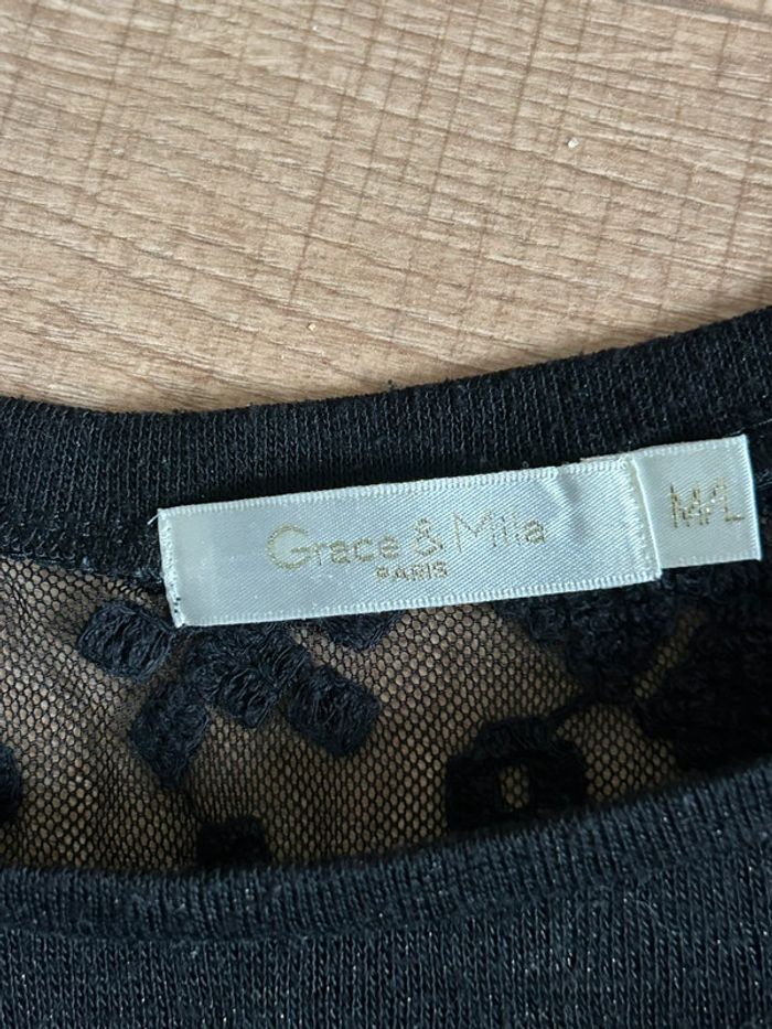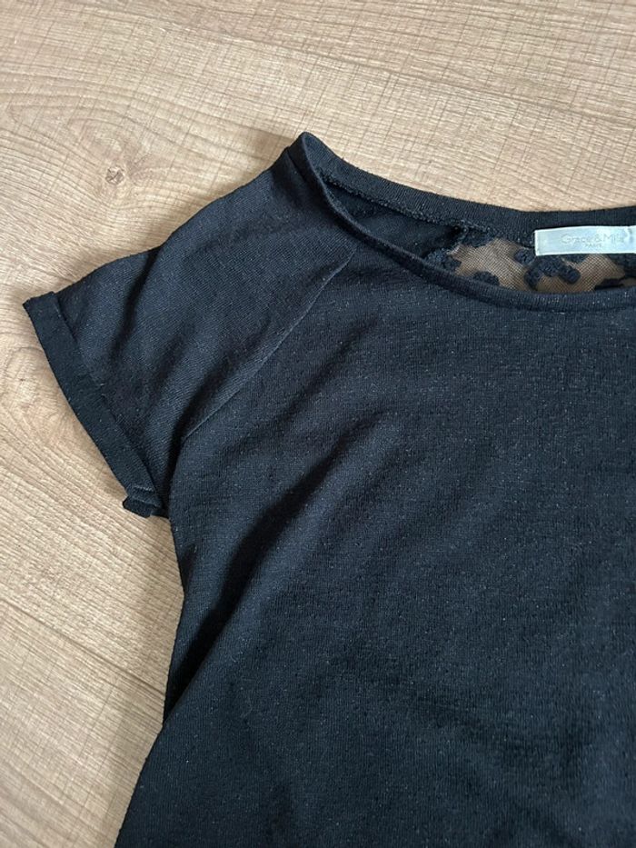 Joli haut noir à manches courtes, avec dentelle, de marque Grace & Mila. Taille M/L. Porté plusieurs fois, en bon état. aisselle à aisselle 45 cms et plus taille 43 cms et plus longueur depuis épaule 56 cms à 60 cms Le tissu est extensible Étiquette intérieure de composition coupée Le prix reste négociable dans la limite du raisonnable. Un petit cadeau dans le colis 🌸 (Boîte 1)