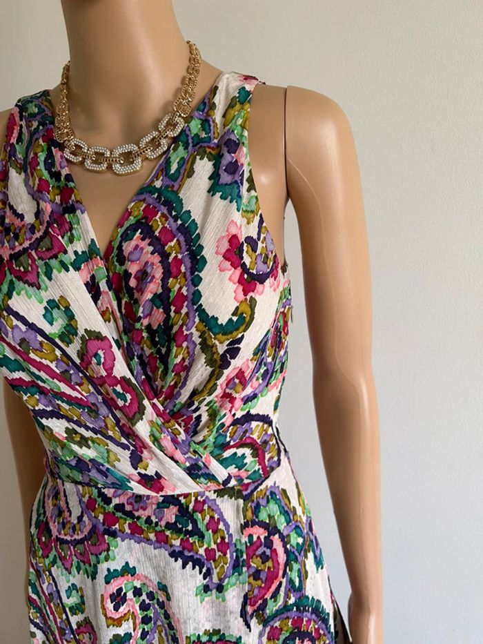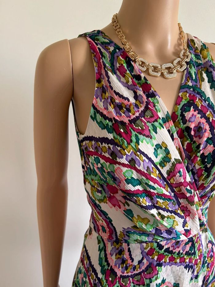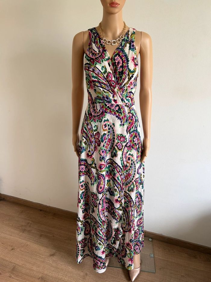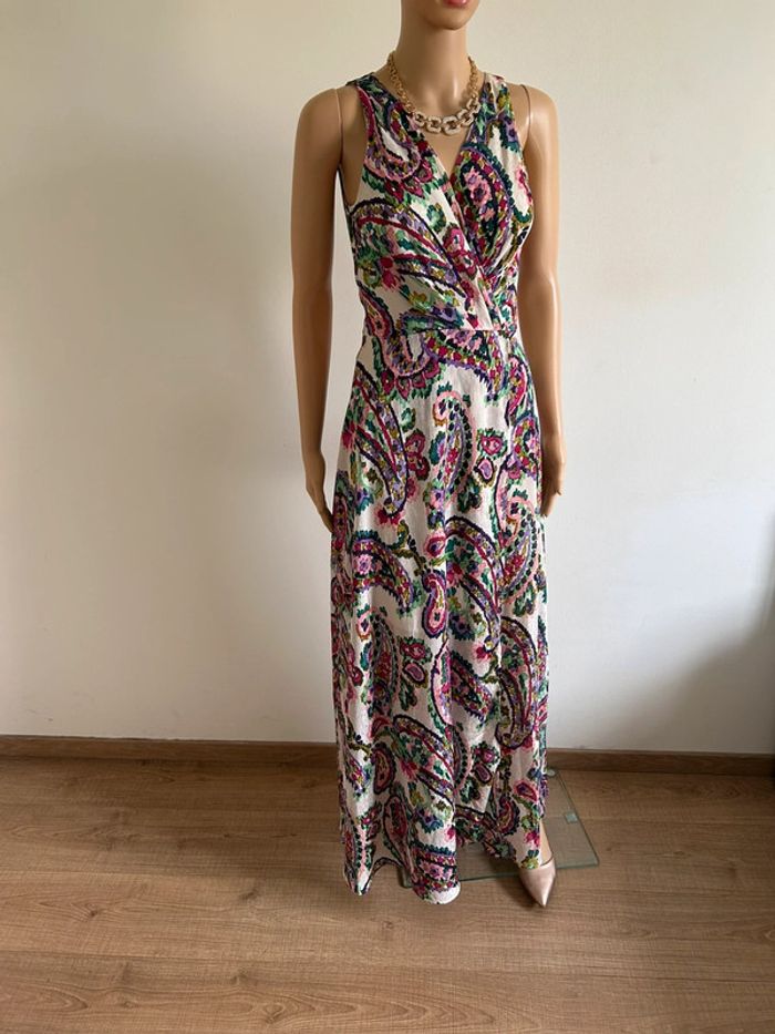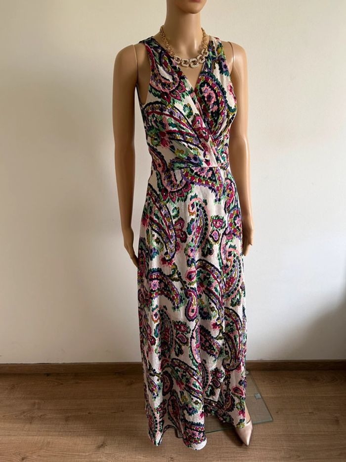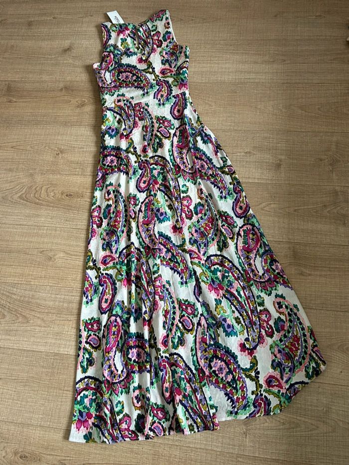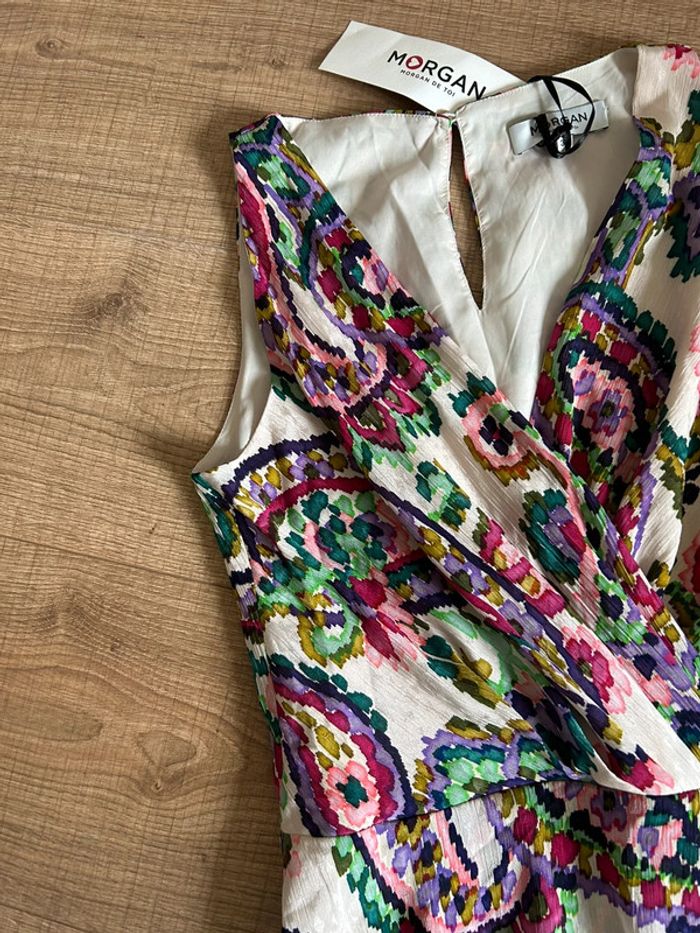 Magnifique robe longue imprimée sans manches, de marque Morgan. Fermeture sur le côté. Taille 34. Elle est neuve avec étiquette (valeur 115€). aisselle à aisselle 40 cms taille 34 cms longueur depuis épaule environ 144 cms 100% polyester Le prix reste négociable dans la limite du raisonnable. Un petit cadeau dans le colis 🌸 (Boîte 13)