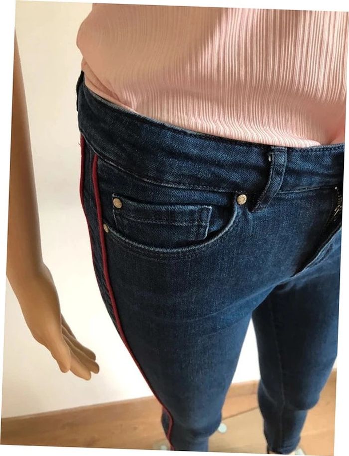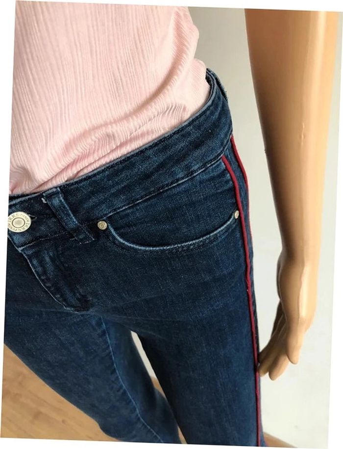 Joli jean slim bleu marine avec bandes rouges, de marque IKKS. Taille 36. Porté quelques fois, en très bon état. taille 35 cms à 38 cms longueur 89 cms longueur entrejambes 73 cms Le tissu est extensible 98% coton et 2% elasthanne Le prix reste négociable dans la limite du raisonnable. Un petit cadeau dans le colis.