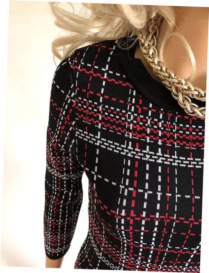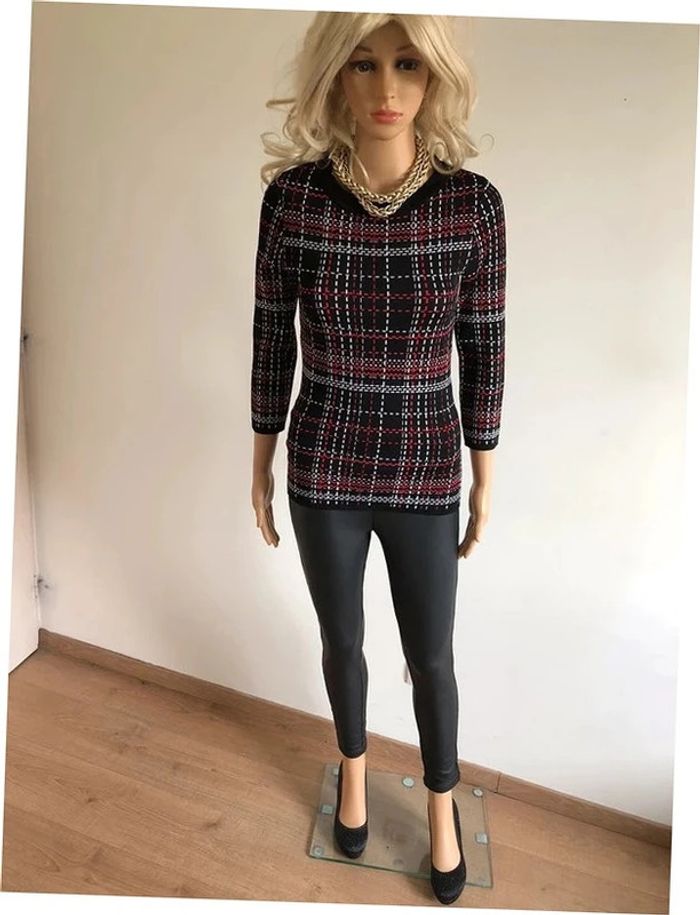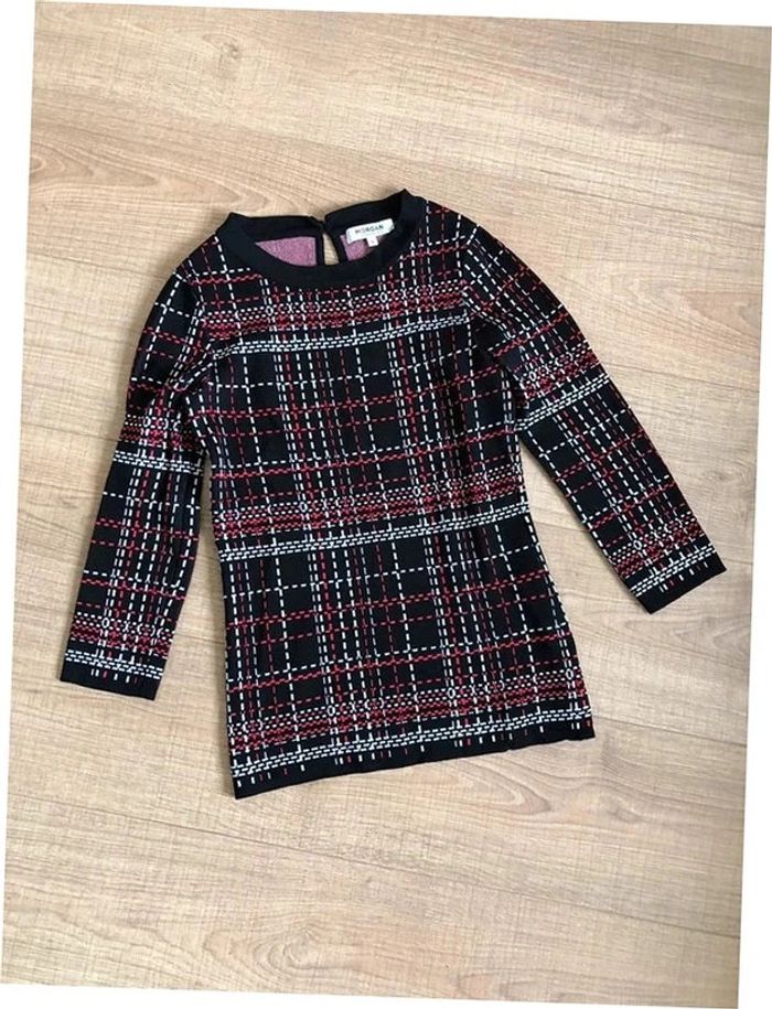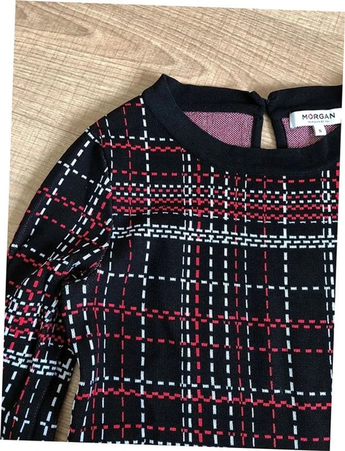Magnifique pull noir rouge et blanc à carreaux, de marque Morgan. Taille S. Jamais porté, mais un léger défaut au niveau du col (voir photo). aisselle à aisselle 38 cms à 45 cms épaule à épaule 33 cms à 38 cms taille 35 cms à 40 cms longueur depuis épaule 63 cms Le tissu est extensible 65% viscose et 35% polyamide Le prix reste négociable dans la limite du raisonnable. Un petit cadeau dans le colis.