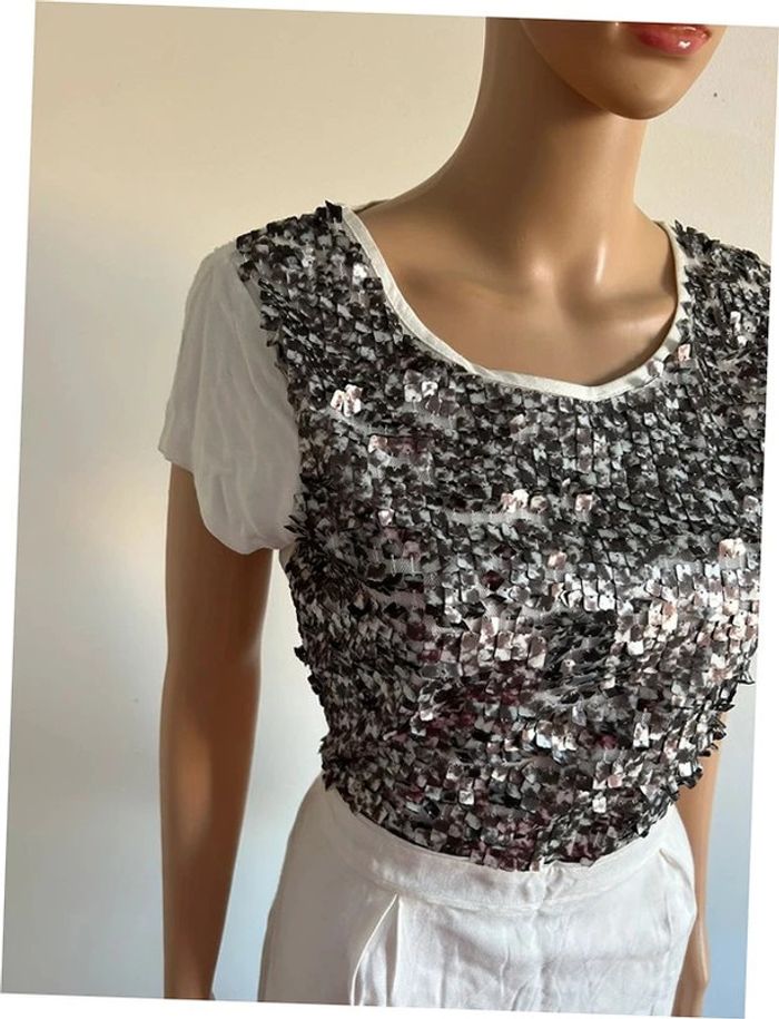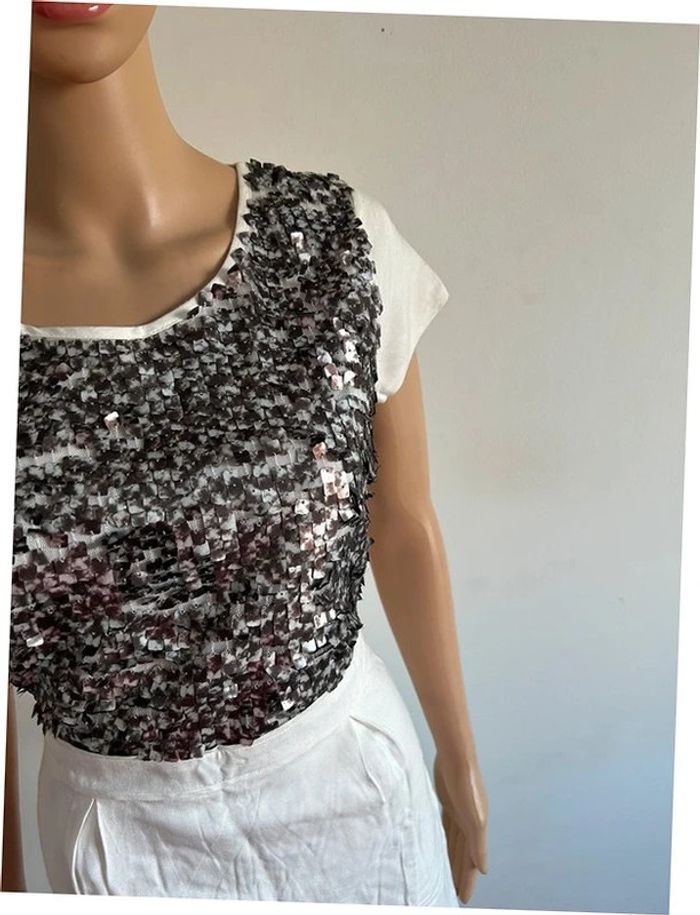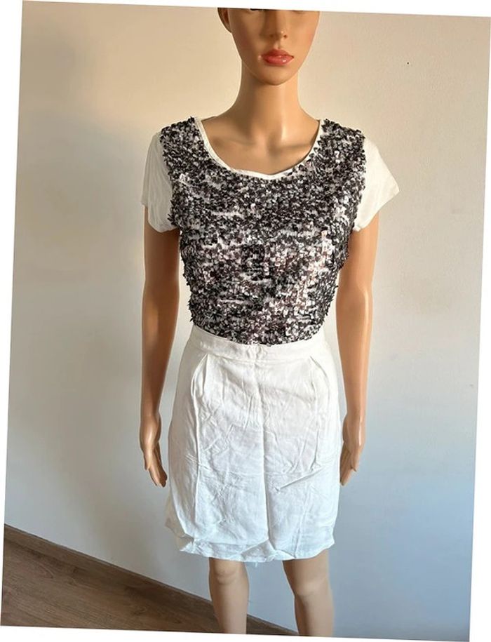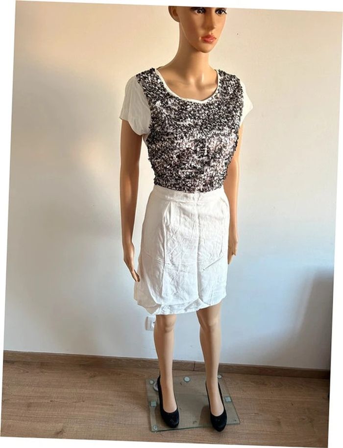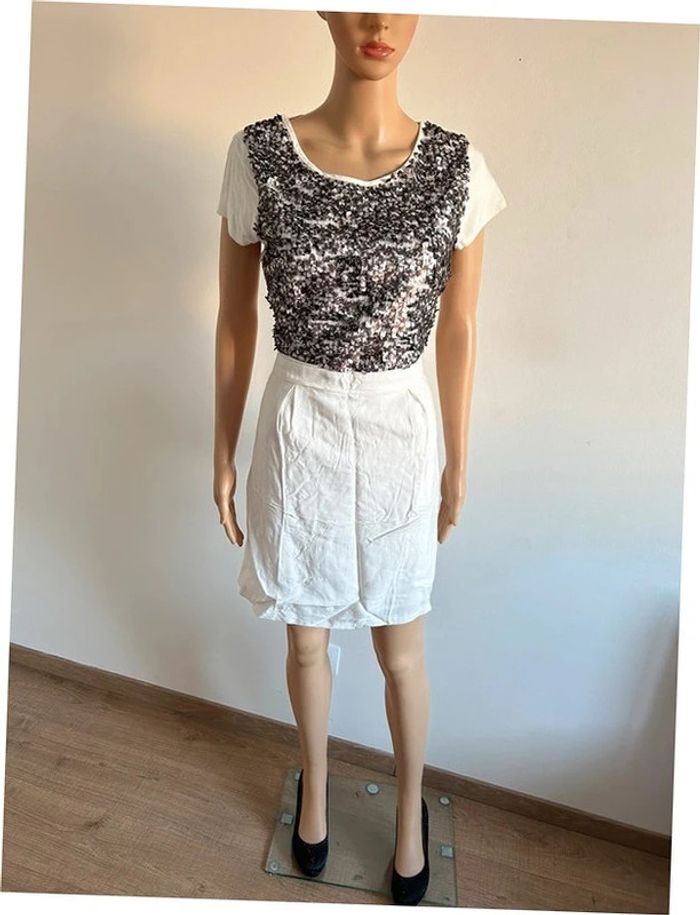 Jolie robe blanche écrue à manches courtes, avec sequins sur le devant, de marque Esprit. Fermeture dans le dos. Taille 40. Elle est neuve avec étiquette mais présente des défauts : il manque des sequins par endroits. aisselle à aisselle 47 cms épaule à épaule 39 cms taille 40 cms longueur depuis épaule 89 cms 100% polyester Le prix reste négociable dans la limite du raisonnable. (Boîte 17)