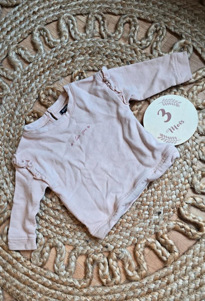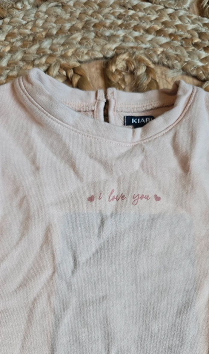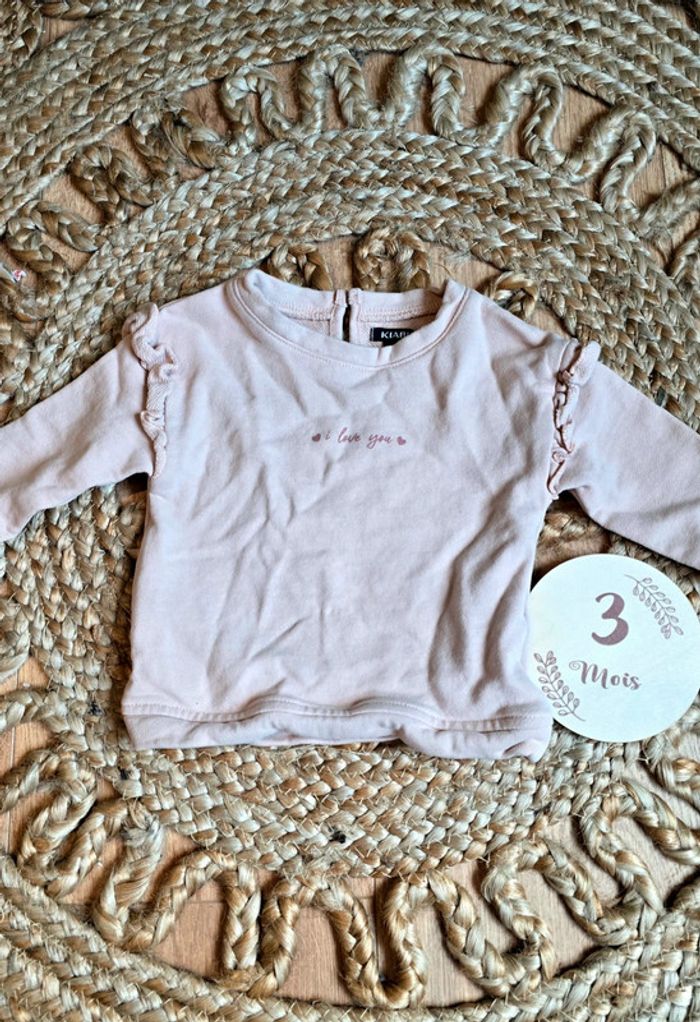 Pull sweat Kiabi rose pâle, I love you sur le devant, volants au manches, taille 3 mois, très bon état #kiabi #pull #sweat #bébé #bébéfille #3mois #lot